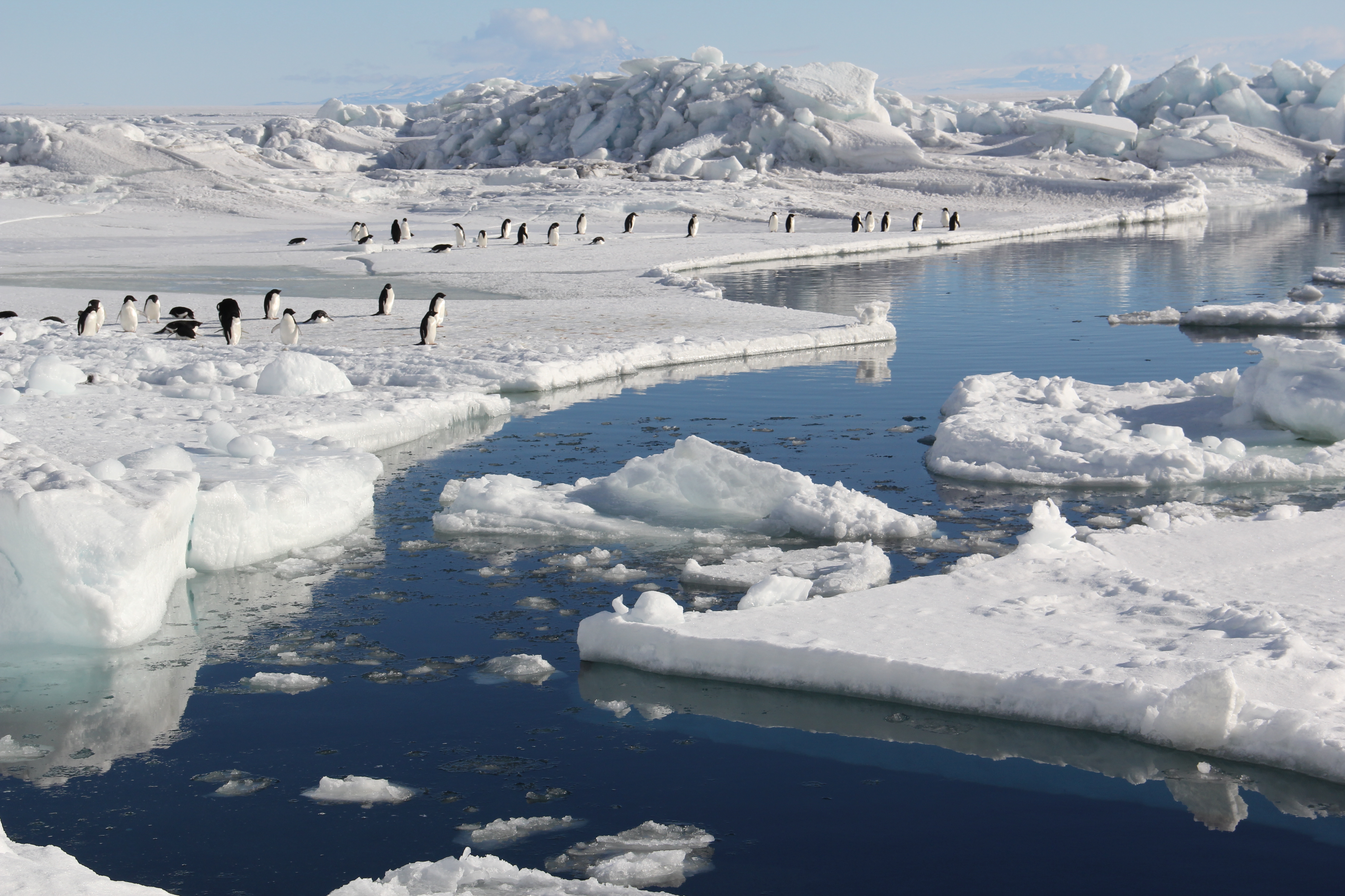 Adélie Penguins enjoy the new pack ice. Cape Royds, Antarctica.