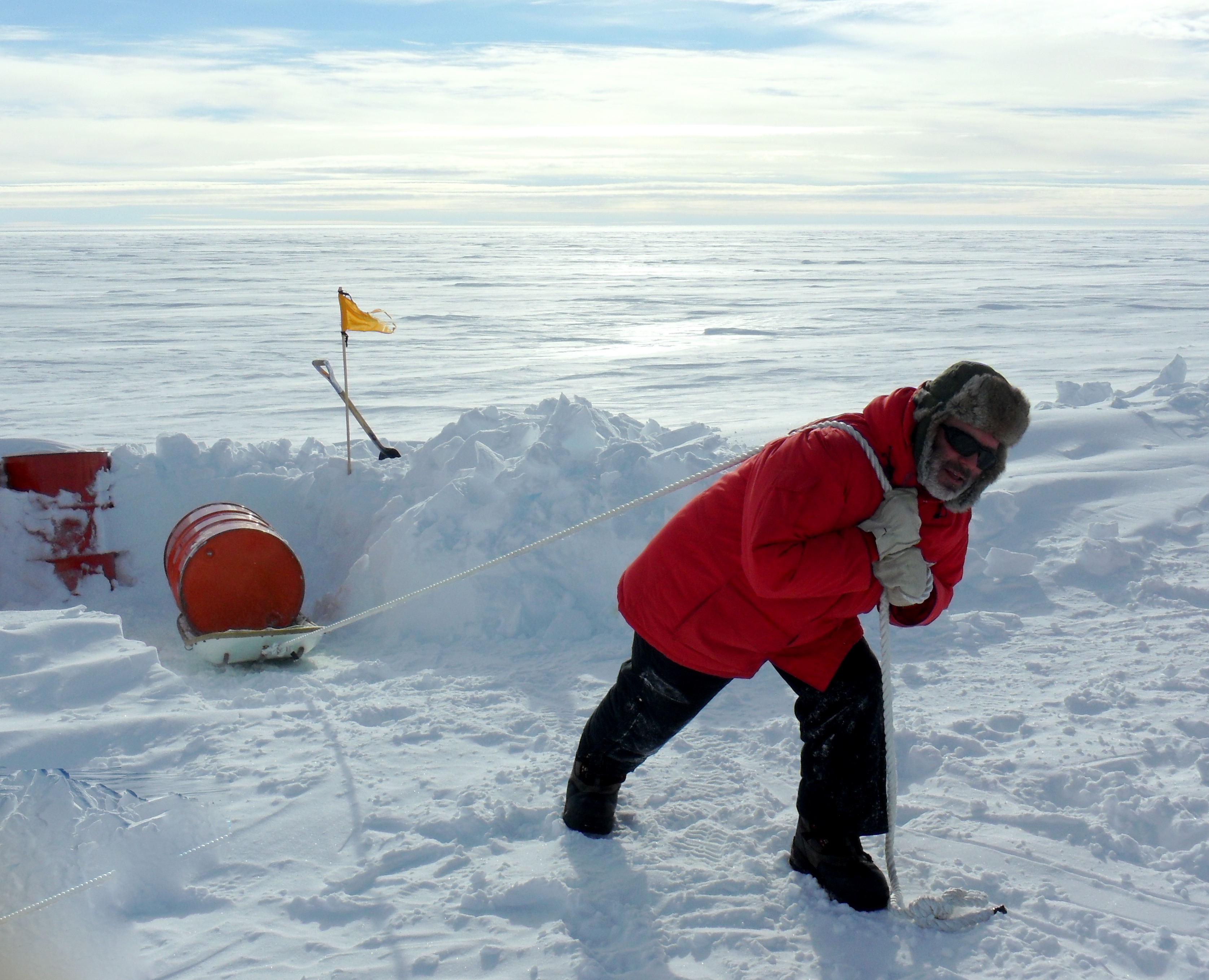 Tim Spuck: "Gil, Bob, and I moved a total of 25 fuel barrels (about 450 pounds each) to safety. Add that to the other 12 barrels we had on site and it ends up we we have about $40,000 of fuel at the AGO #2 site. Fuel is very expensive here in Antarctica." Automatic Geophysical Observatory (AGO) #2 Site on the East Antarctic Plateau.