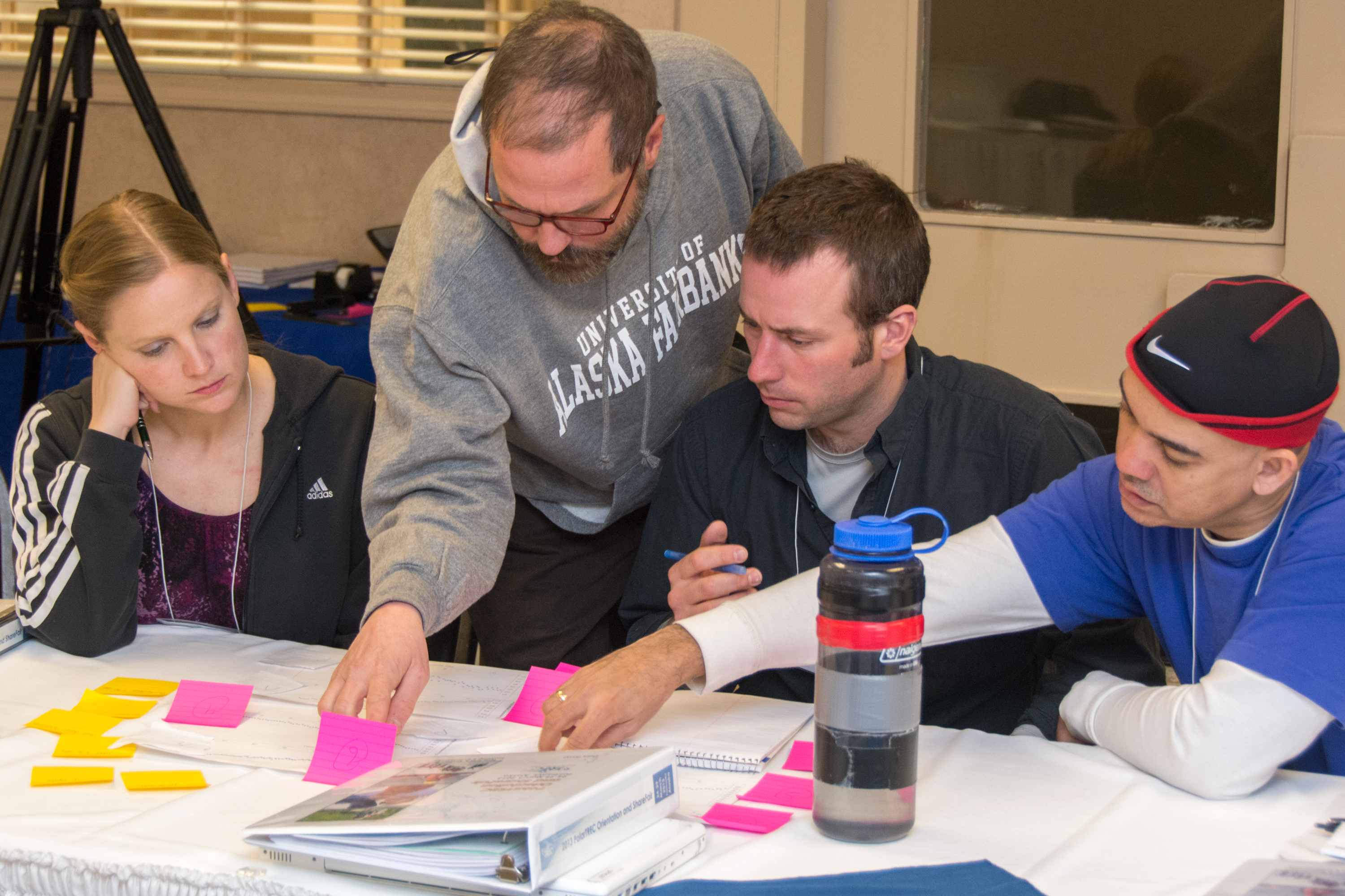 PolarTREC teachers Alicia Gillean, Glenn Clark, Dan Frost, and Obed Fulcar ponder data during the PolarTREC Orientation. Fairbanks, Alaska.