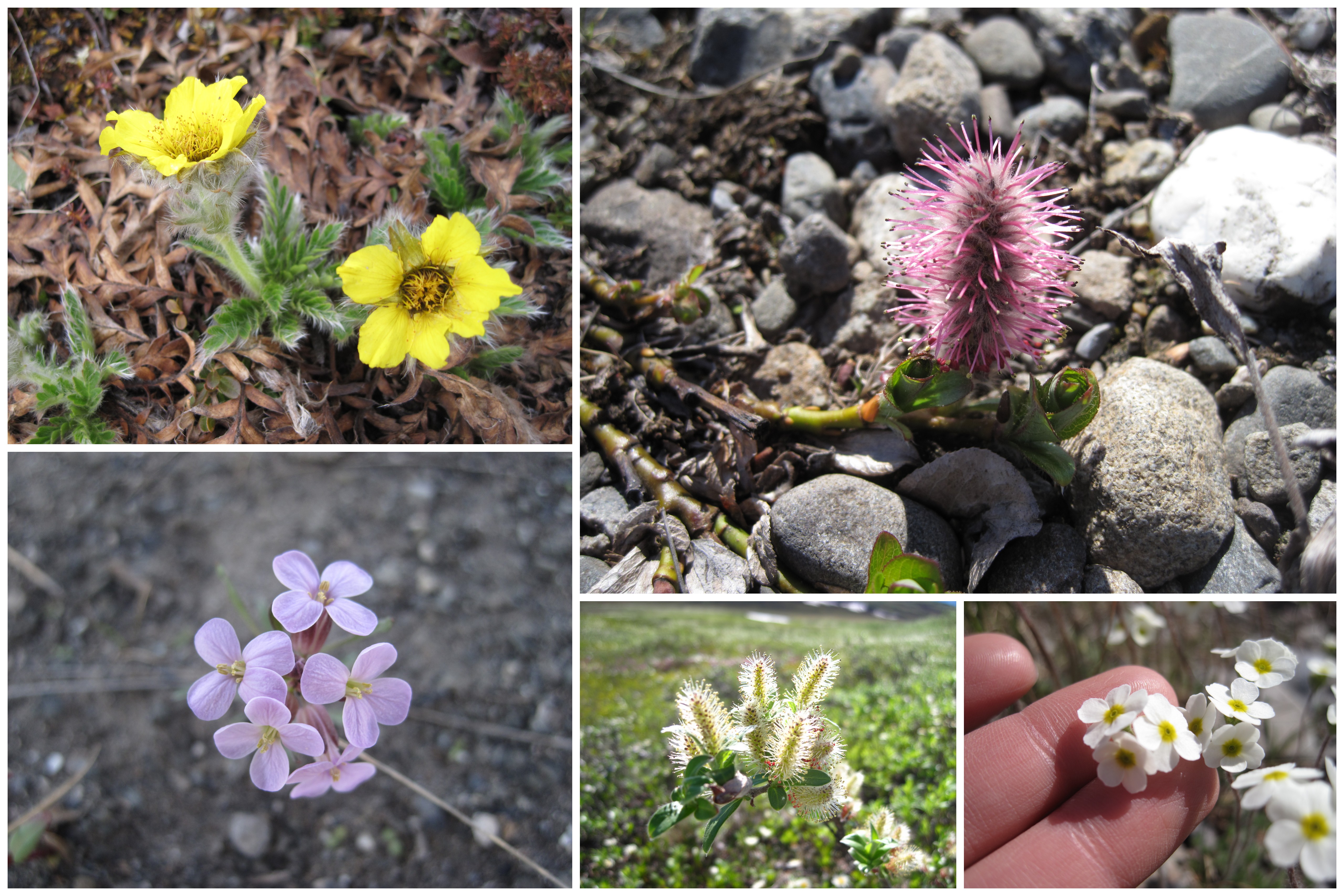 Flowers near the Atigun River on the North Slope. Upper left: Glacier avens, part of the rose family. Atigun River near Toolik Field Station, Alaska.