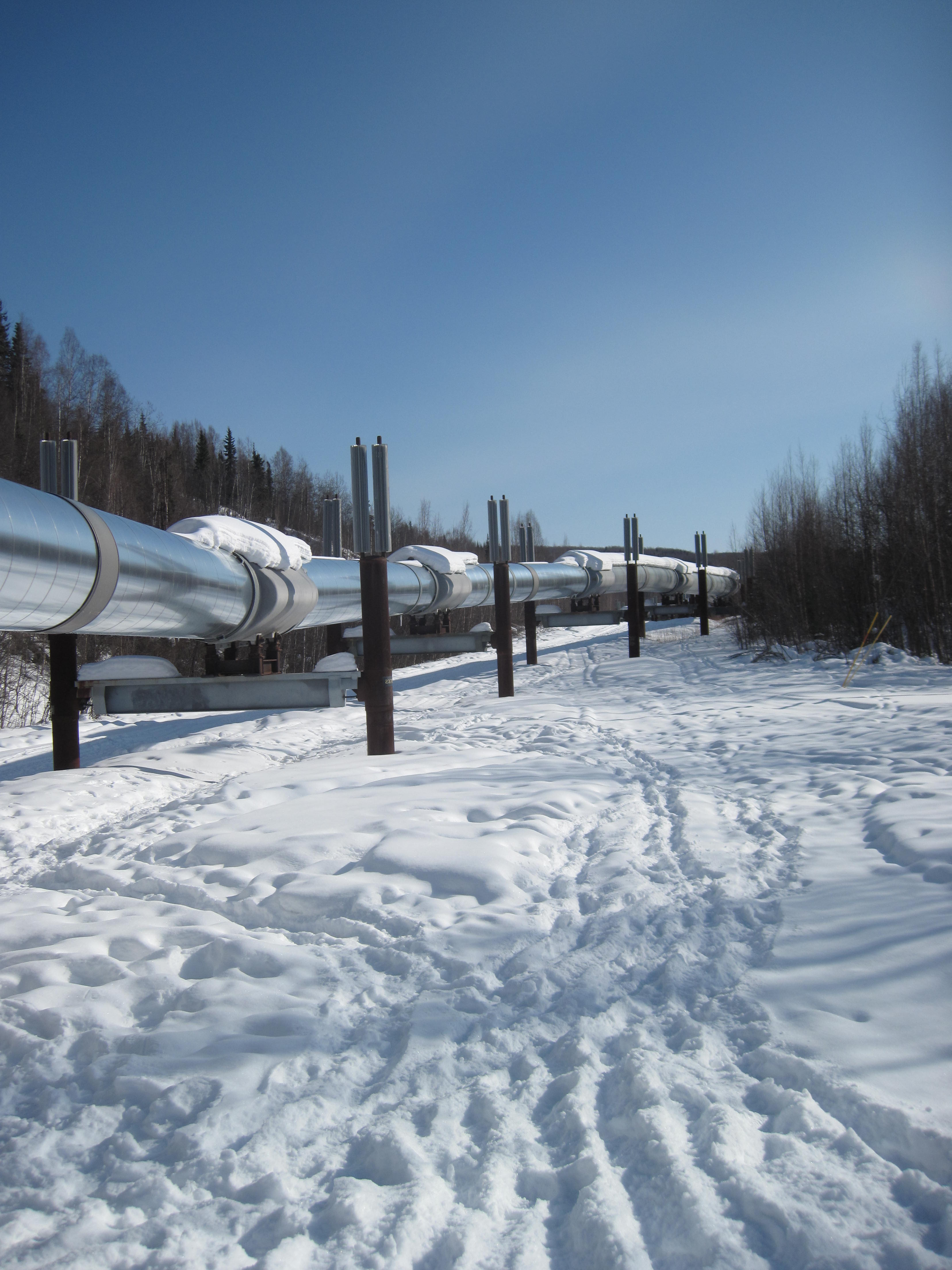 The Trans-Alaska Pipeline stretches for 800 miles, above and below the ground. Fox, Alaska.