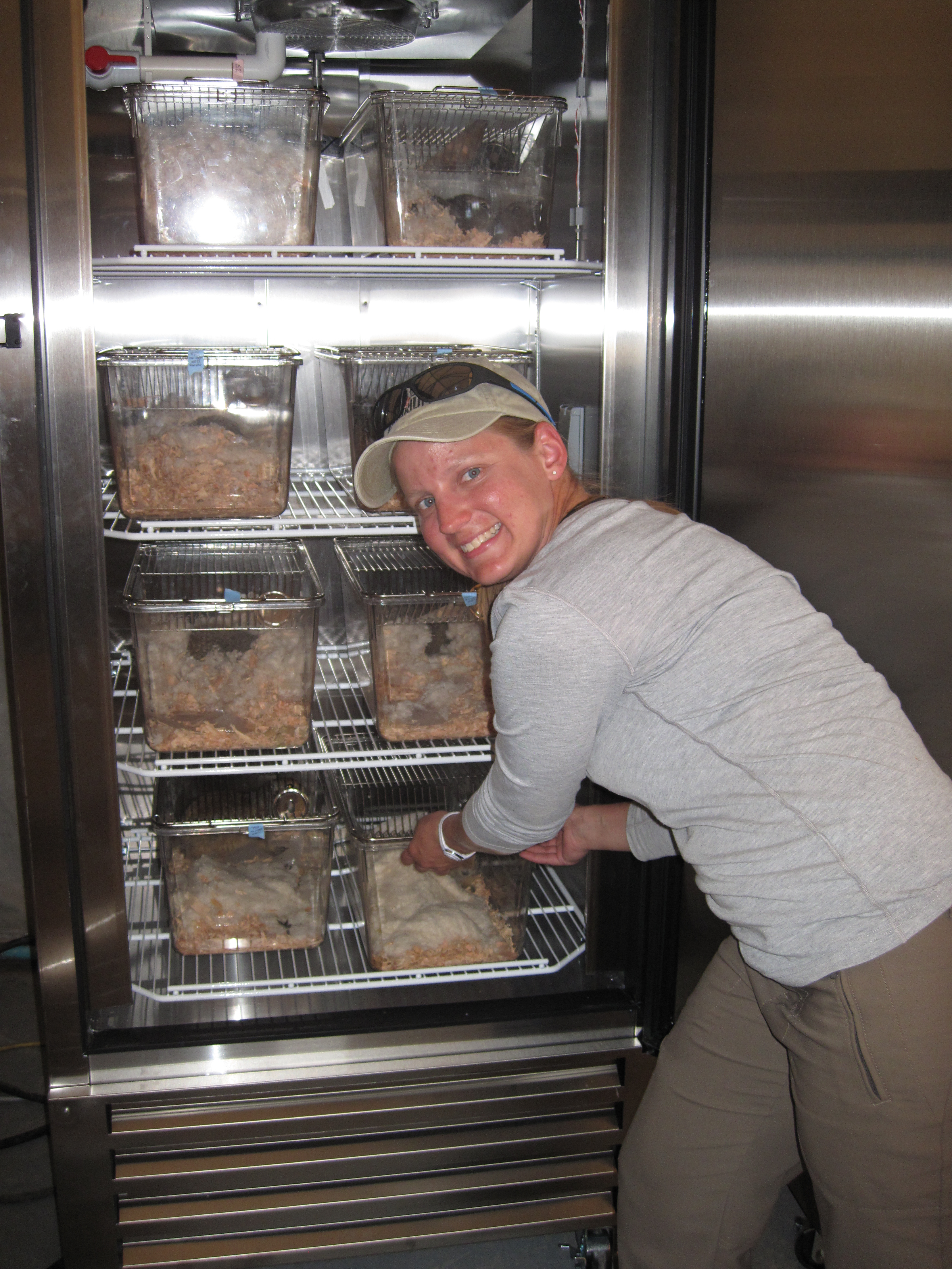 Alicia Gillean adds an Arctic ground squirrel to the environmental chamber. Toolik Field Station, Alaska.