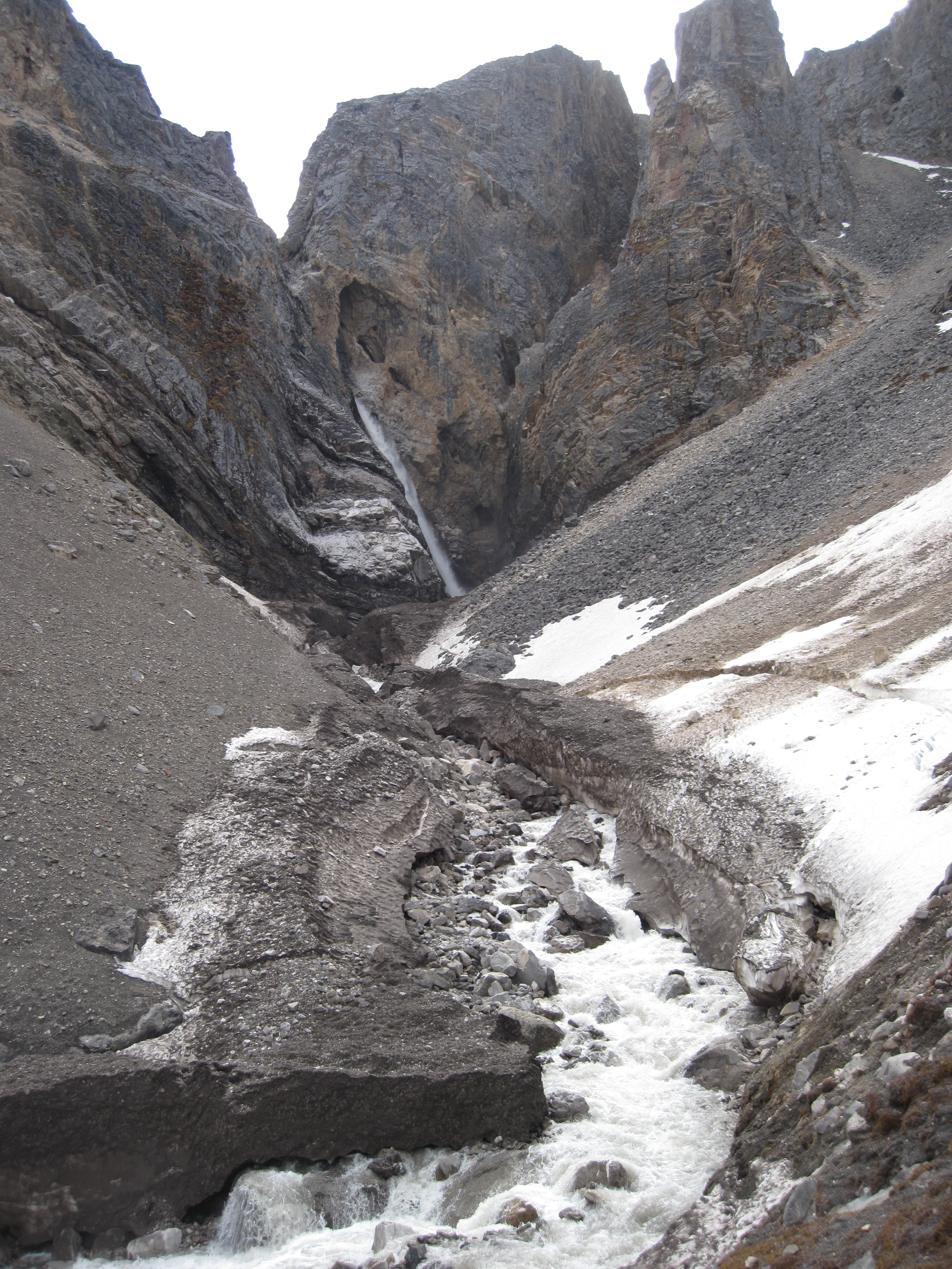 Alicia Gillean: "Atigun Gorge/Waterfall was interesting, but required a rather sketchy walk across rocks from a previous avalanche and snow to get very close, so we enjoyed it from a distance." Atigun River near Toolik Field Station, Alaska.