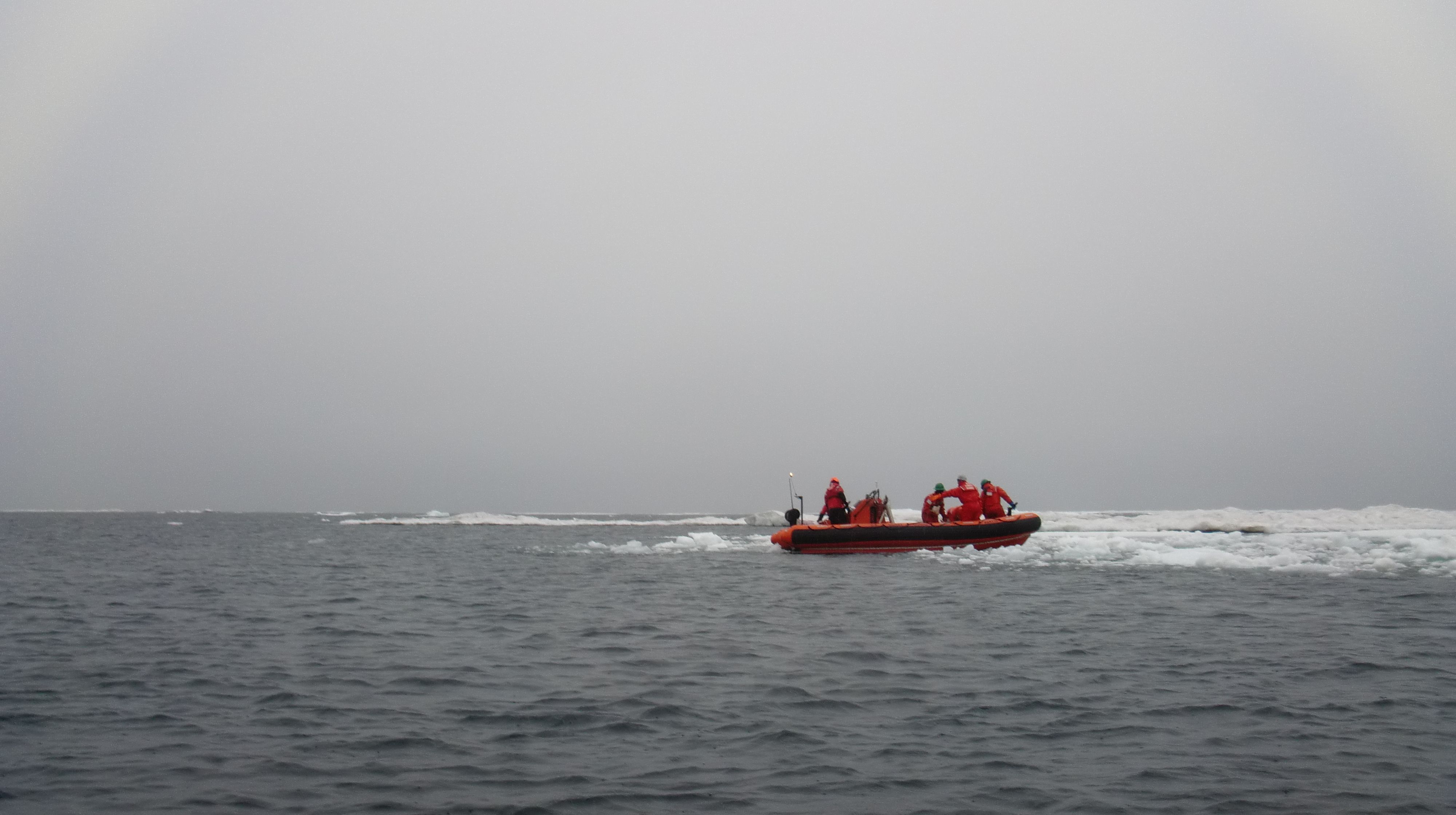 Team members ride a zodiac boat away from the USCGC Healy icebreaker on the Chukchi Sea.
