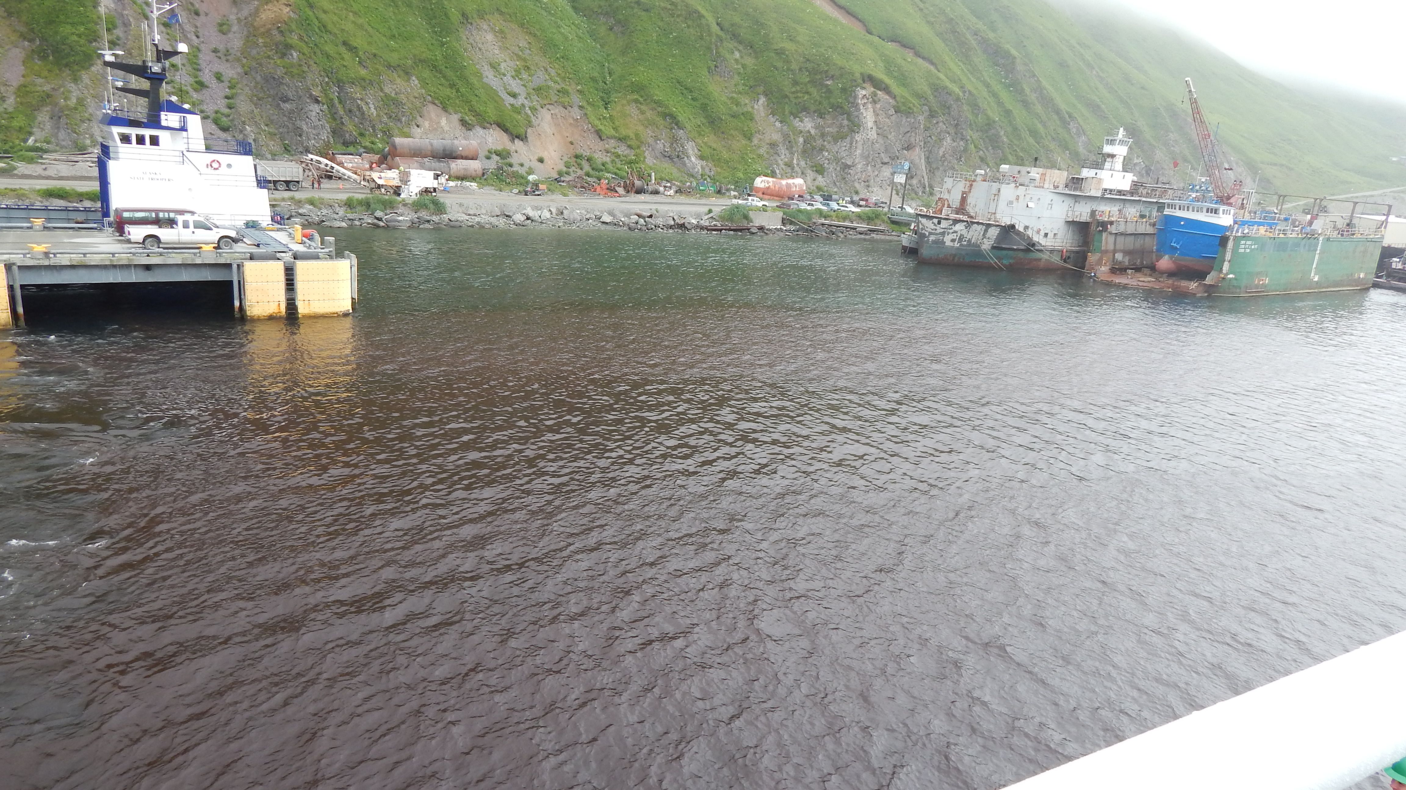 Andrea Skloss: "Do you see the deep red color in the water? That is red tide!" Aboard the USCGC Healy icebreaker, docked in Dutch Harbor, Alaska.