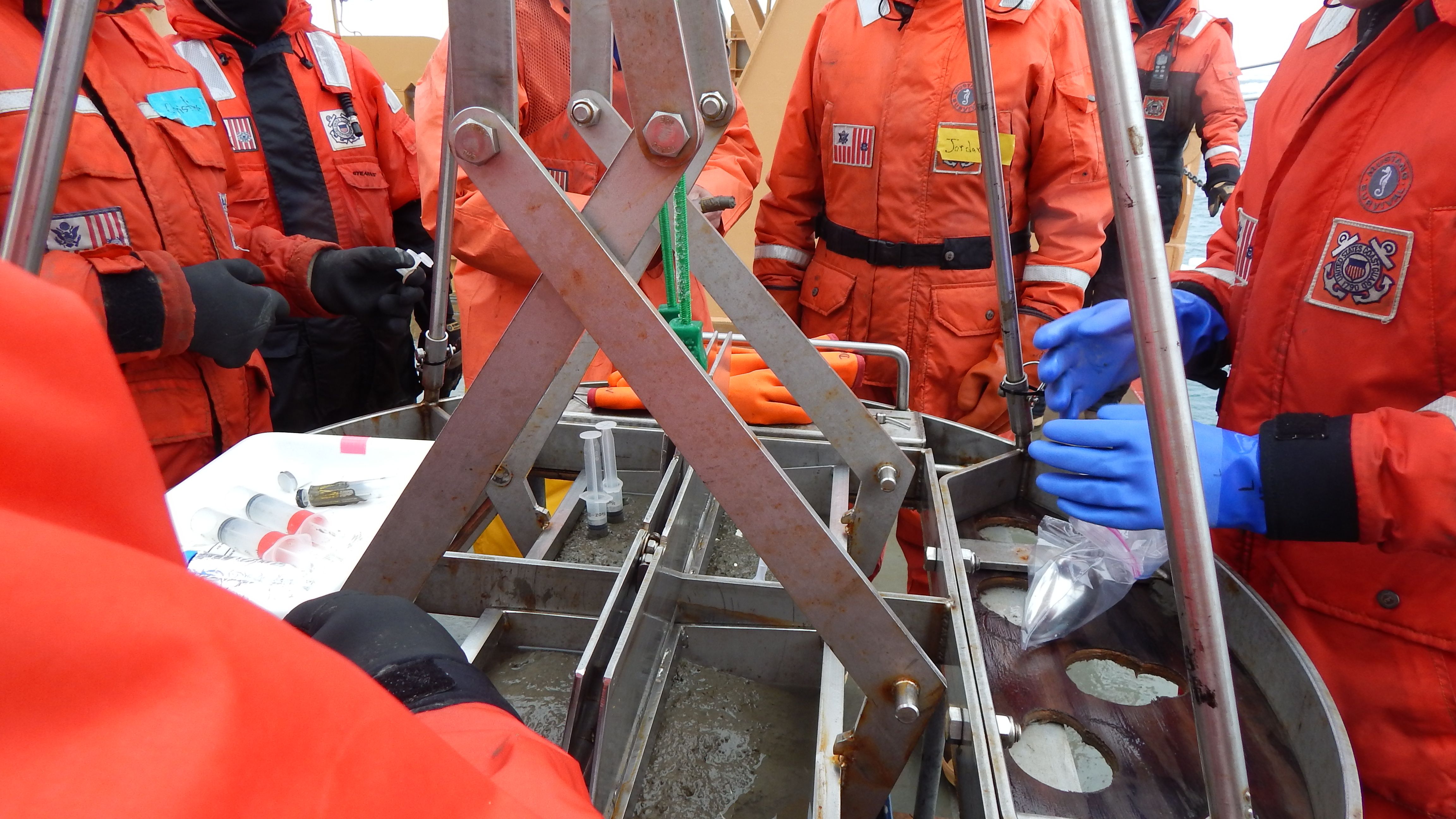 The team works with surface sediment samples. Aboard the USCGC Healy icebreaker on the Chukchi Sea.
