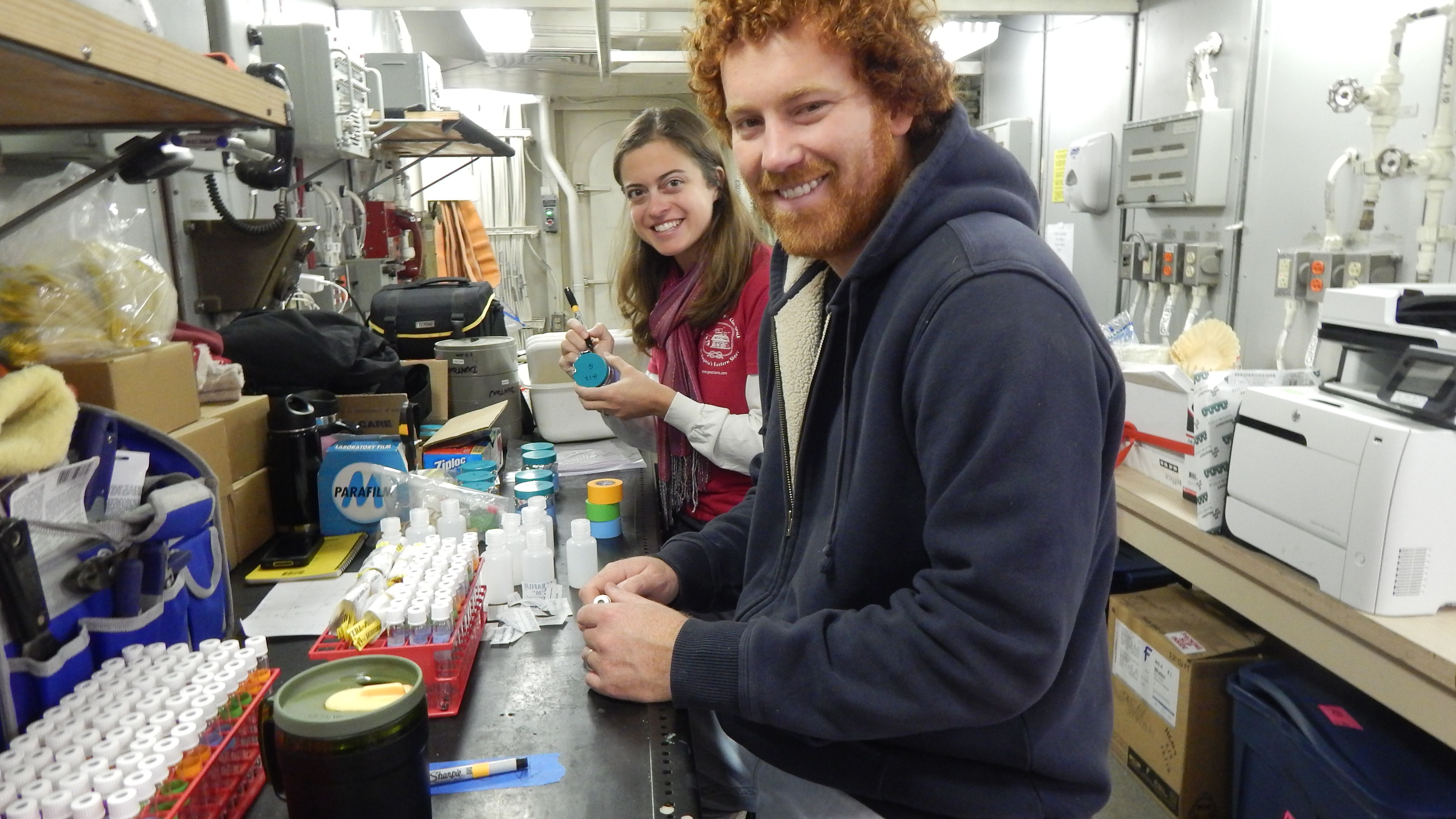 Nathan and Amber get their sample vials ready. Aboard the USCGC Healy icebreaker on the Chukchi Sea.