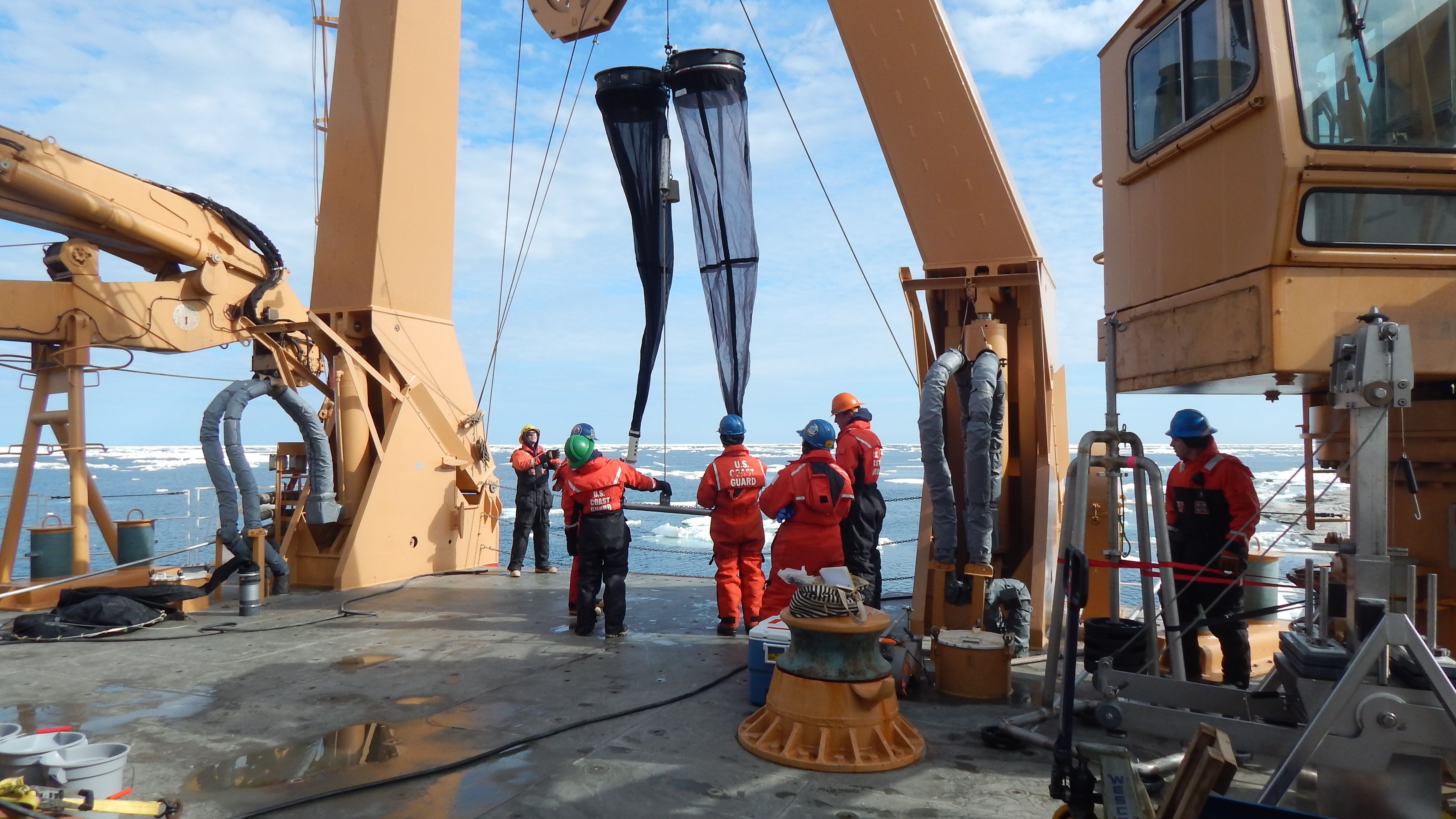 The bongo net has two nets, each having a different mesh size. One net is 150 microns and the other net is 500 microns. Aboard the USCGC Healy icebreaker on the Chukchi Sea.