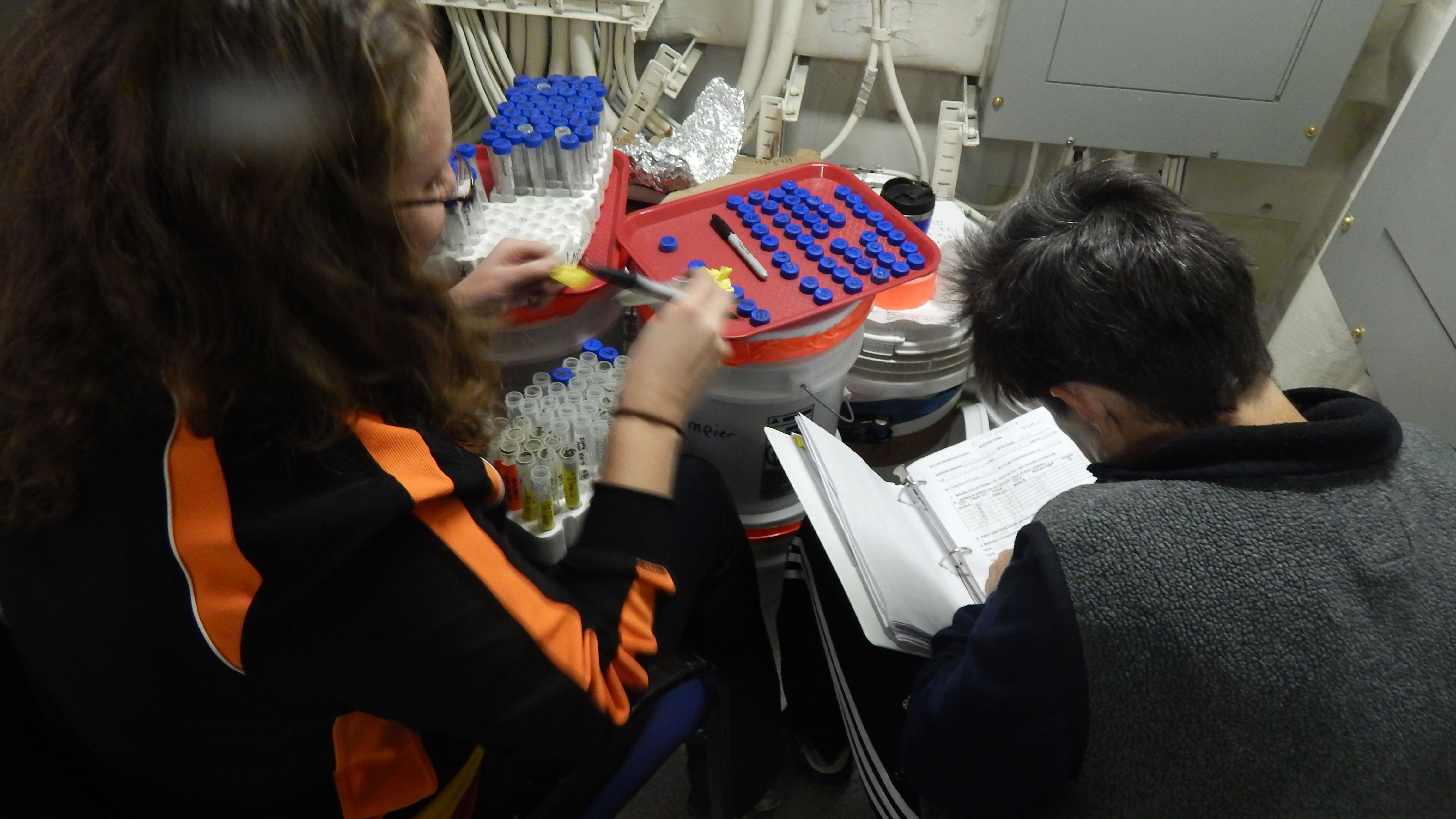 Holly and Christina add acetone to sediment samples for chlorophyll analysis. Aboard the USCGC Healy icebreaker on the Chukchi Sea.