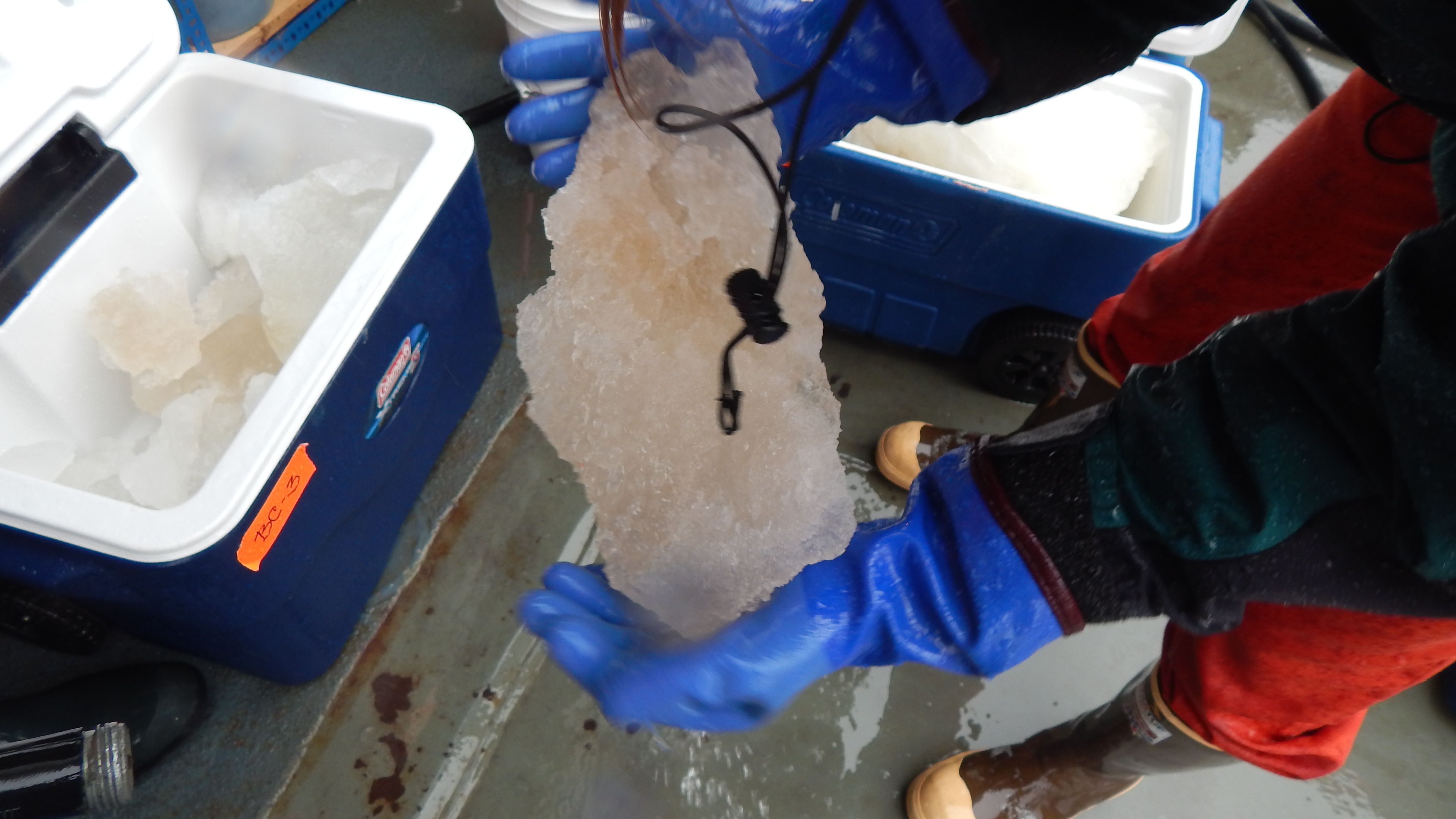 Andrea Skloss: "The ice algae can be a yellow brown in color or have a pinkish shade." Aboard the USCGC Healy icebreaker on the Chukchi Sea.
