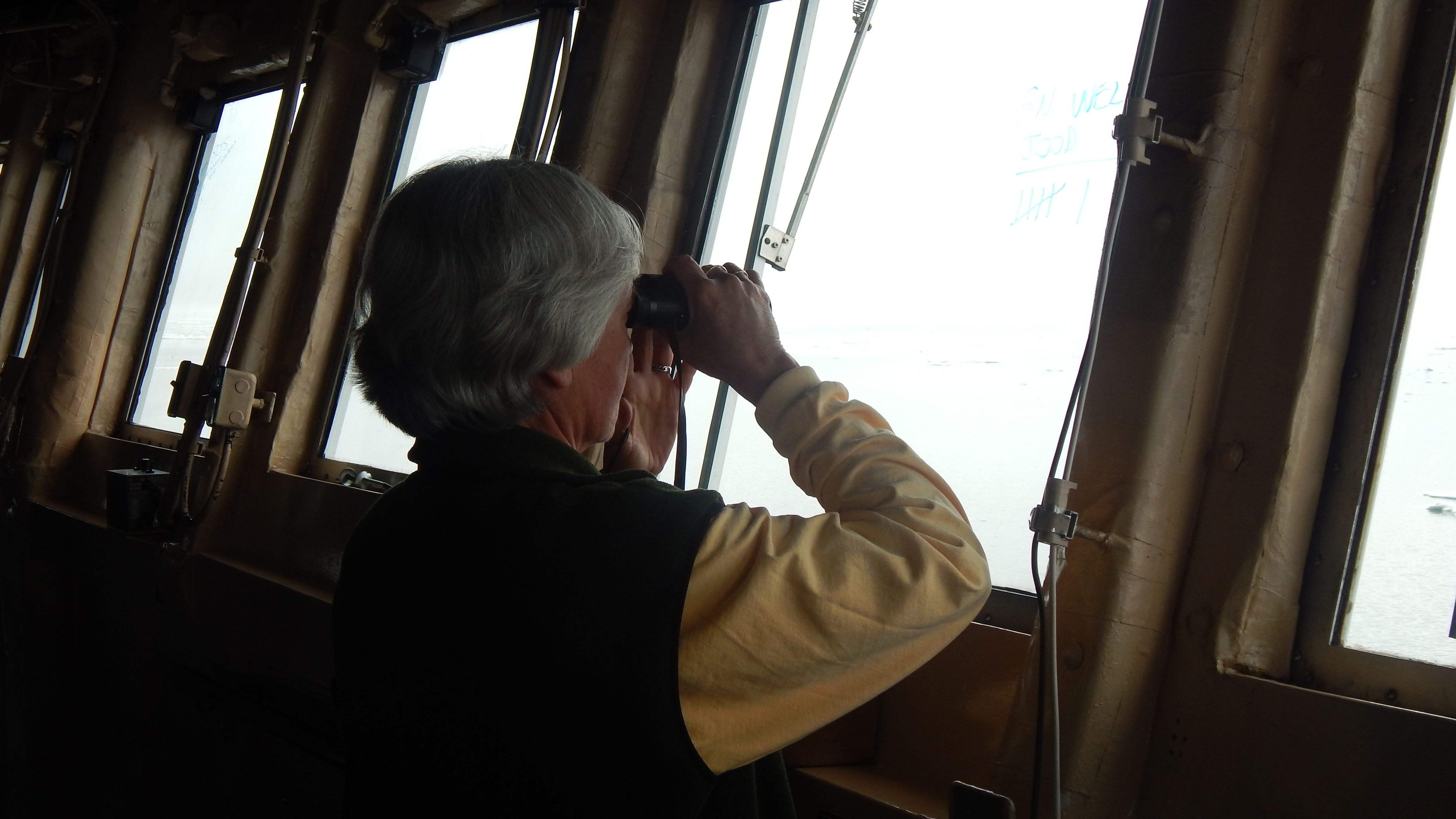 Sue Moore uses binoculars to look for marine mammals. Aboard the USCGC Healy icebreaker on the Chukchi Sea.