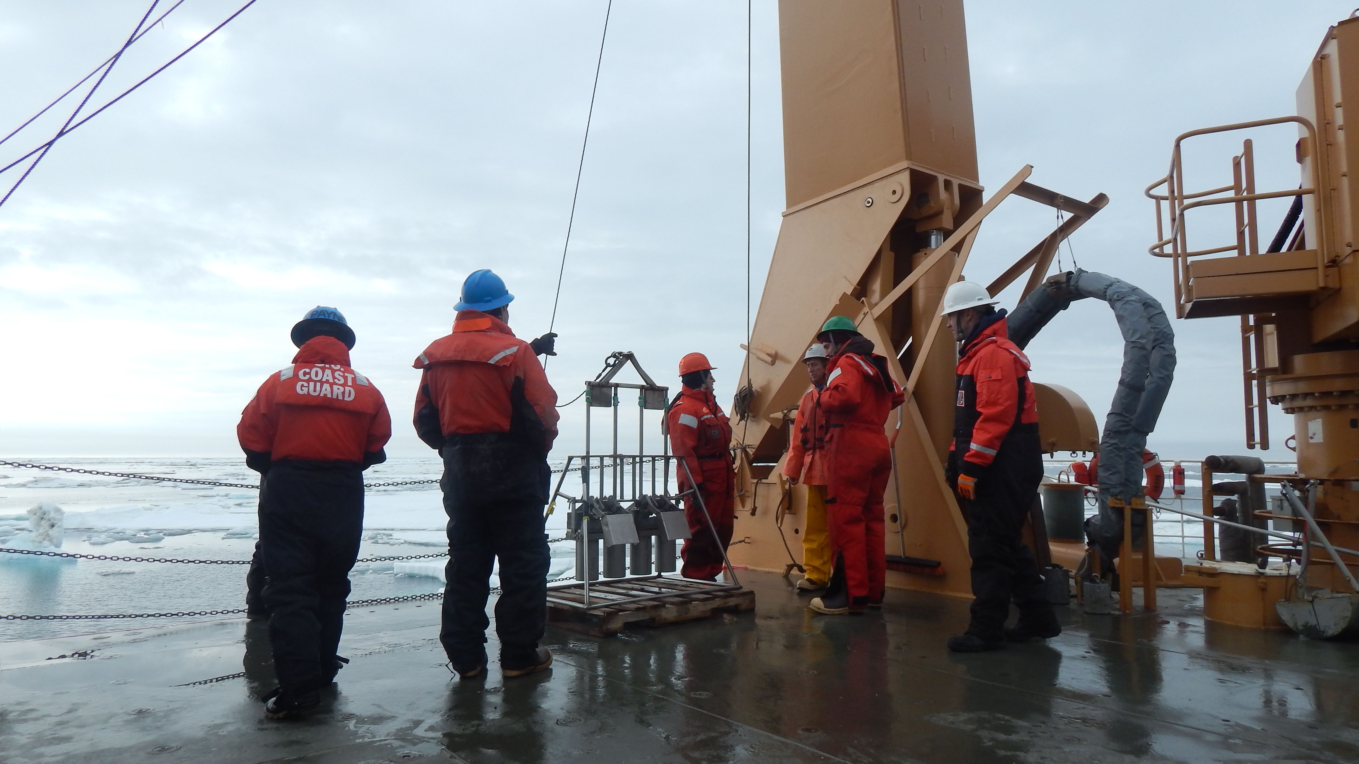The team brings up the multi-HAPS core sampler. Aboard the USCGC Healy icebreaker on the Chukchi Sea.