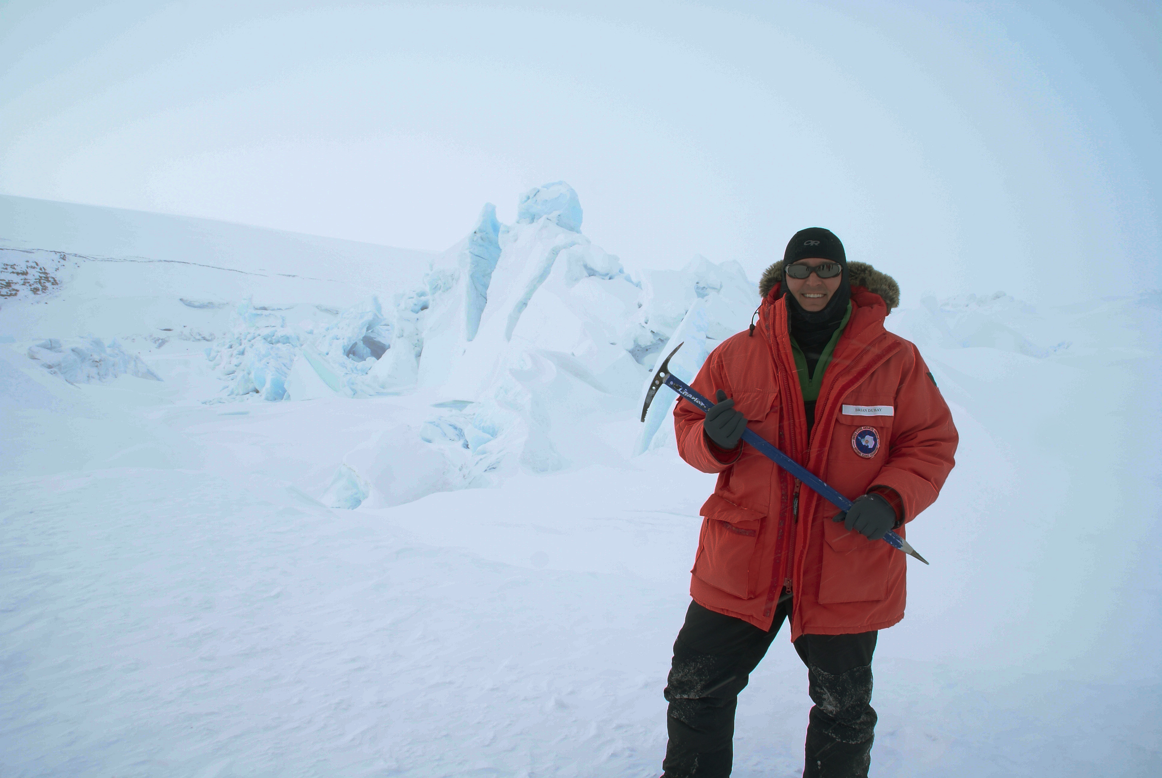 Brian DuBay stands in front of a pressure ridge in the sea ice, near New Zealand's Scott Base, Antarctica.
