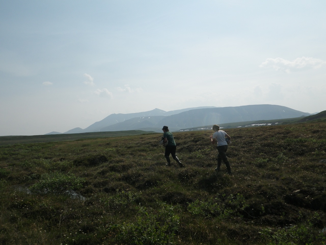 Katie Harrold and Susanna trudge across the tundra on their way to the Sagavanirktok River. Near Toolik Field Station, Alaska.