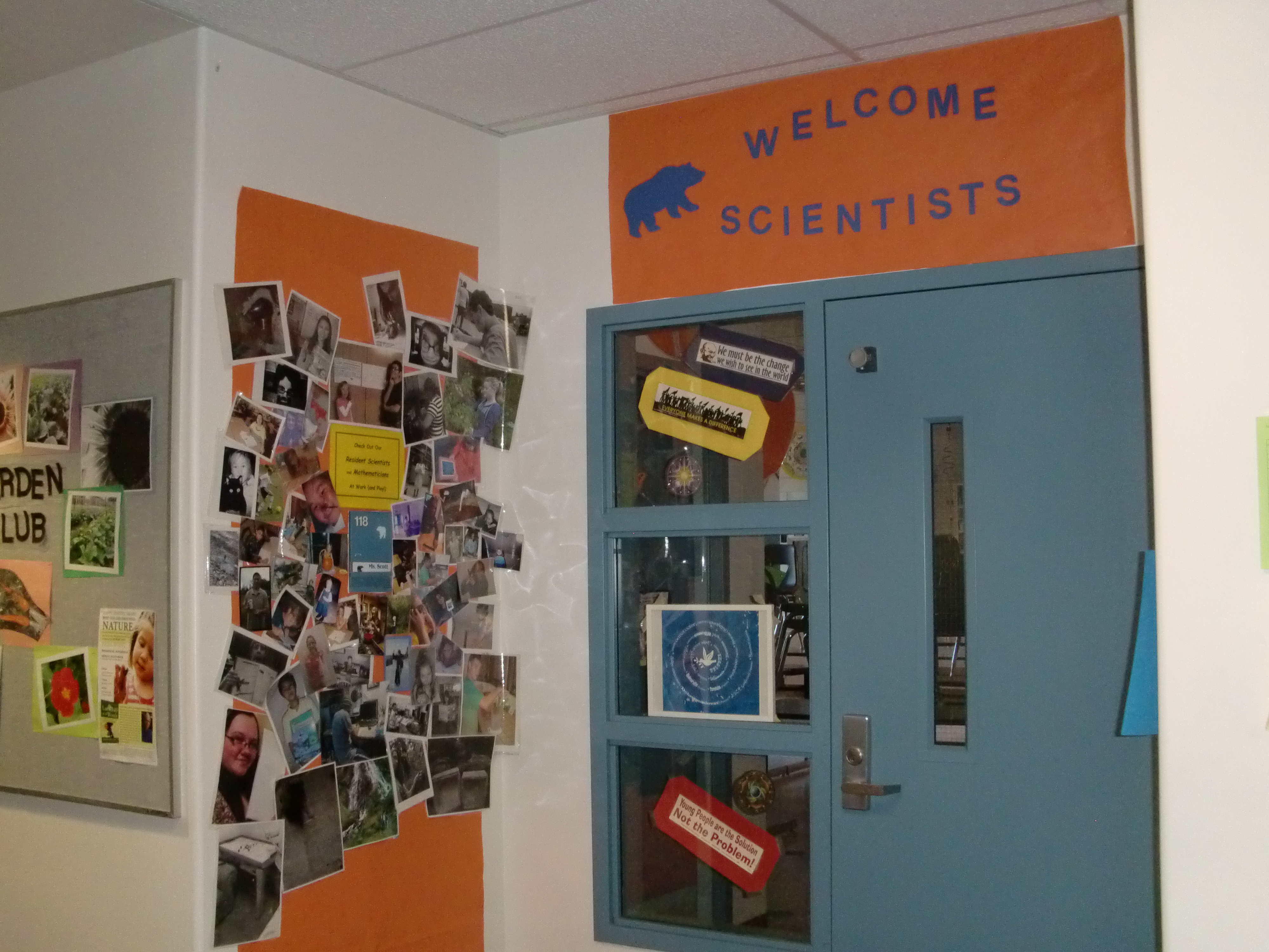 Carol Scott: "The entryway to my current classroom. I ask students to bring in photos of themselves engaged in science (and this year math as well), which results in some great action shots!" Fairbanks, Alaska.