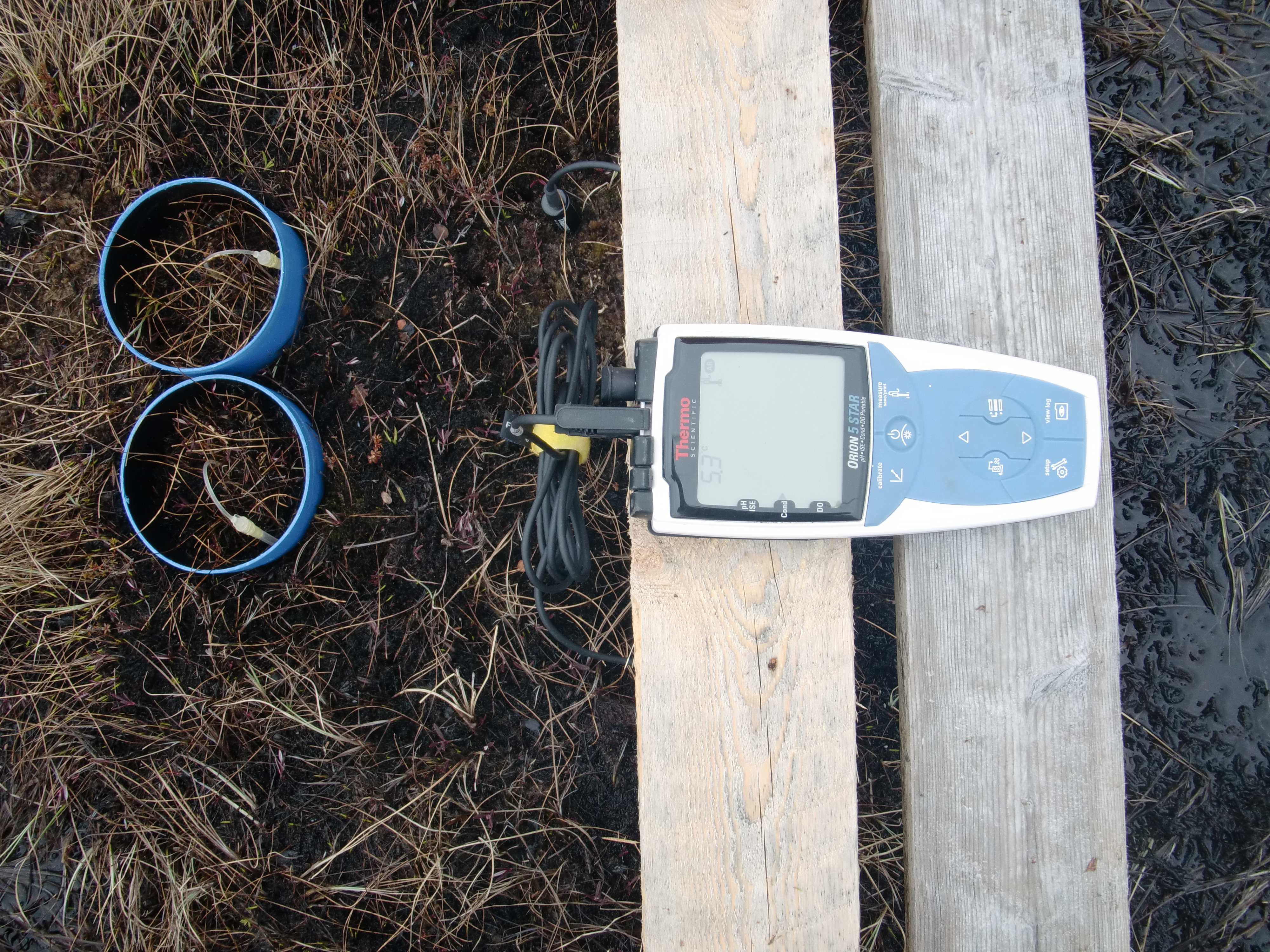 Soil collars isolate the area of wetland from which the carbon flux will be measured. These collars extend down about 20 cm. Petsikko wetland, south of Kevo Research Station, Finland.