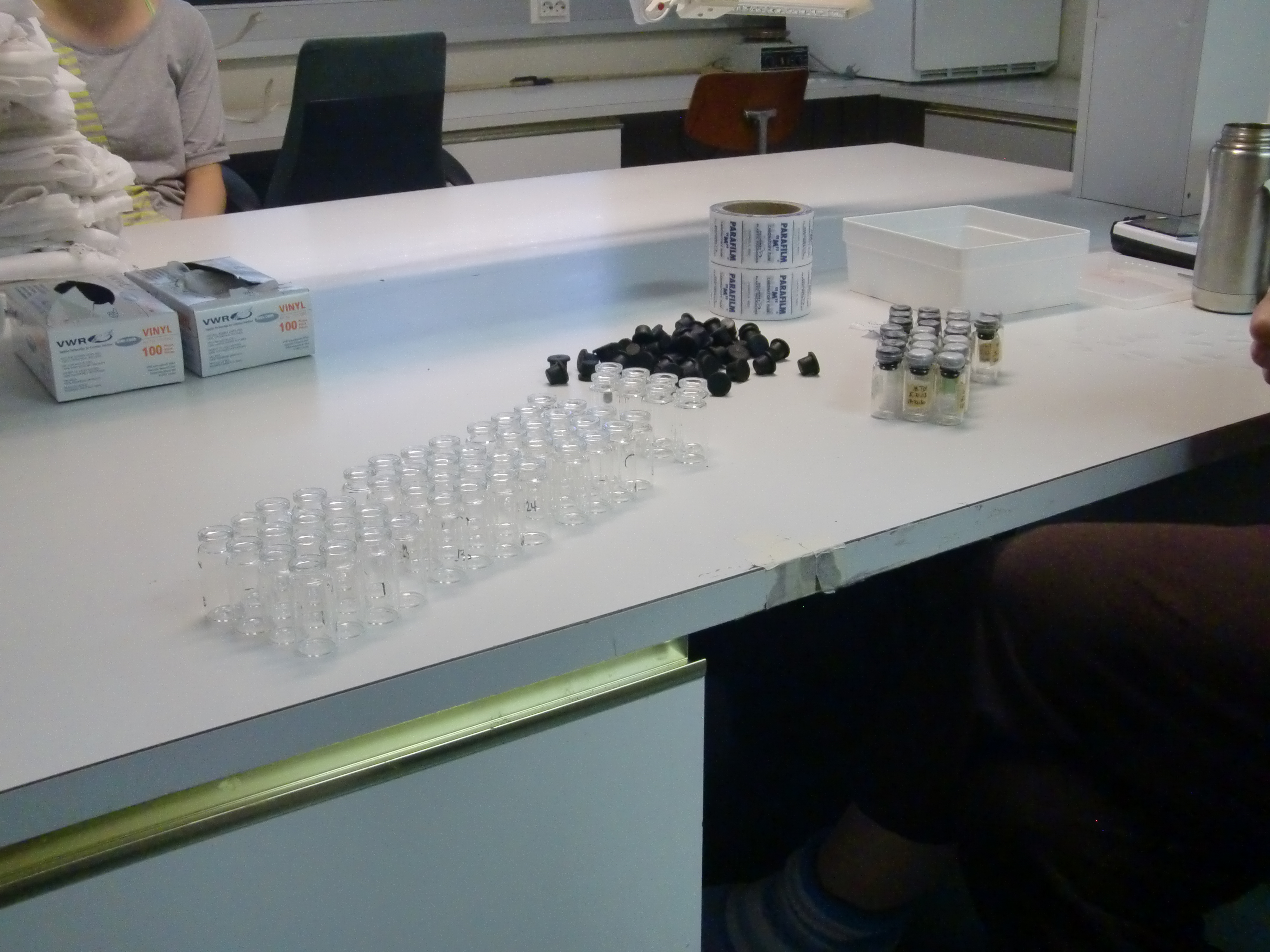These 10 ml gas vials will be sealed with with a rubber stopper, then the air trapped inside will be taken out with a syringe. Kevo Research Station, Finland.