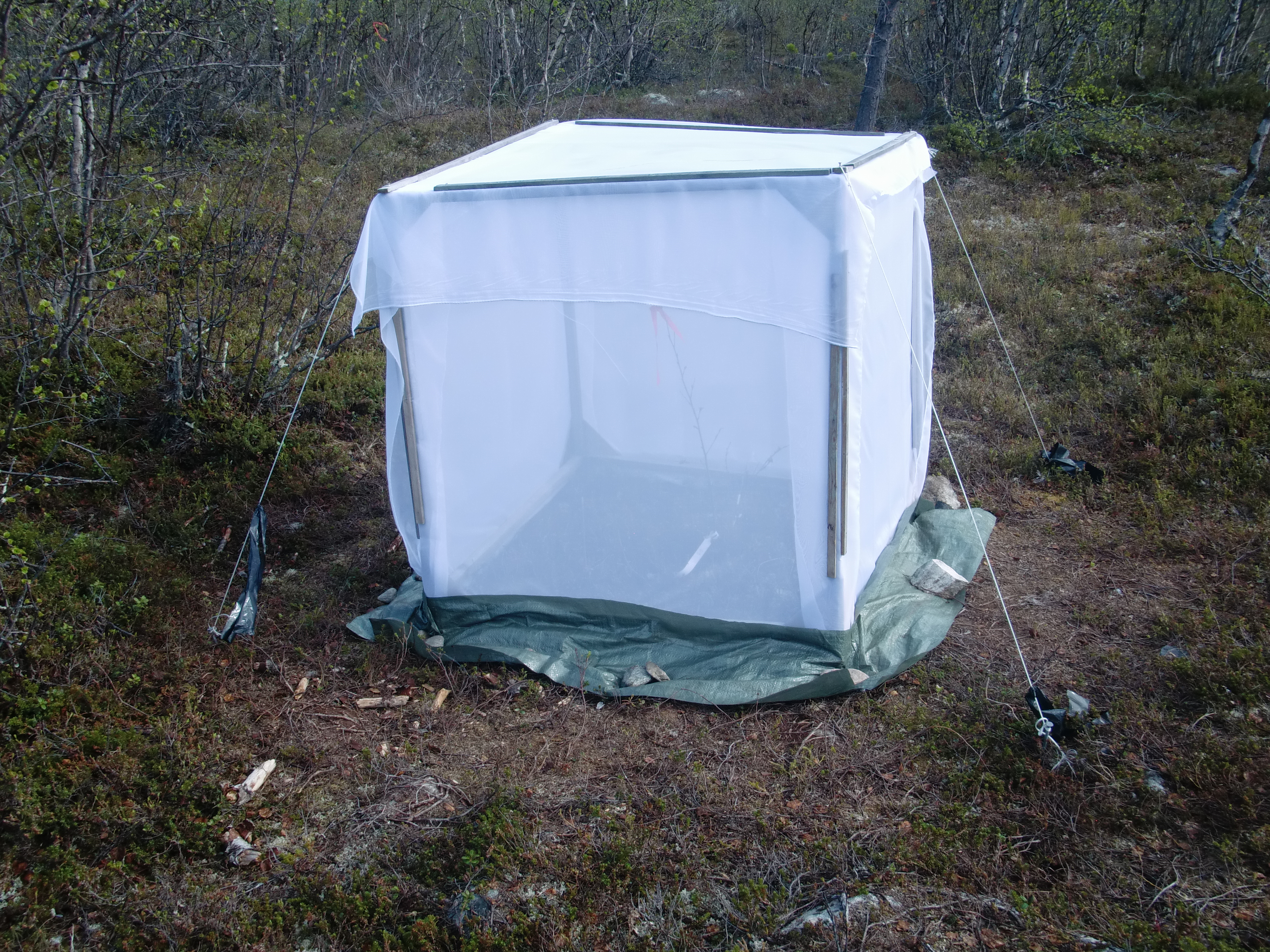 The frame is covered and ready for the larvae of the autumnal moth. They will eat the young koivu (birch) leaves inside the enclosure, then later in the summer they will form cacoons on the ground. The enclosure will prevent them from spreading to other areas. Kevo Research Station, Finland.