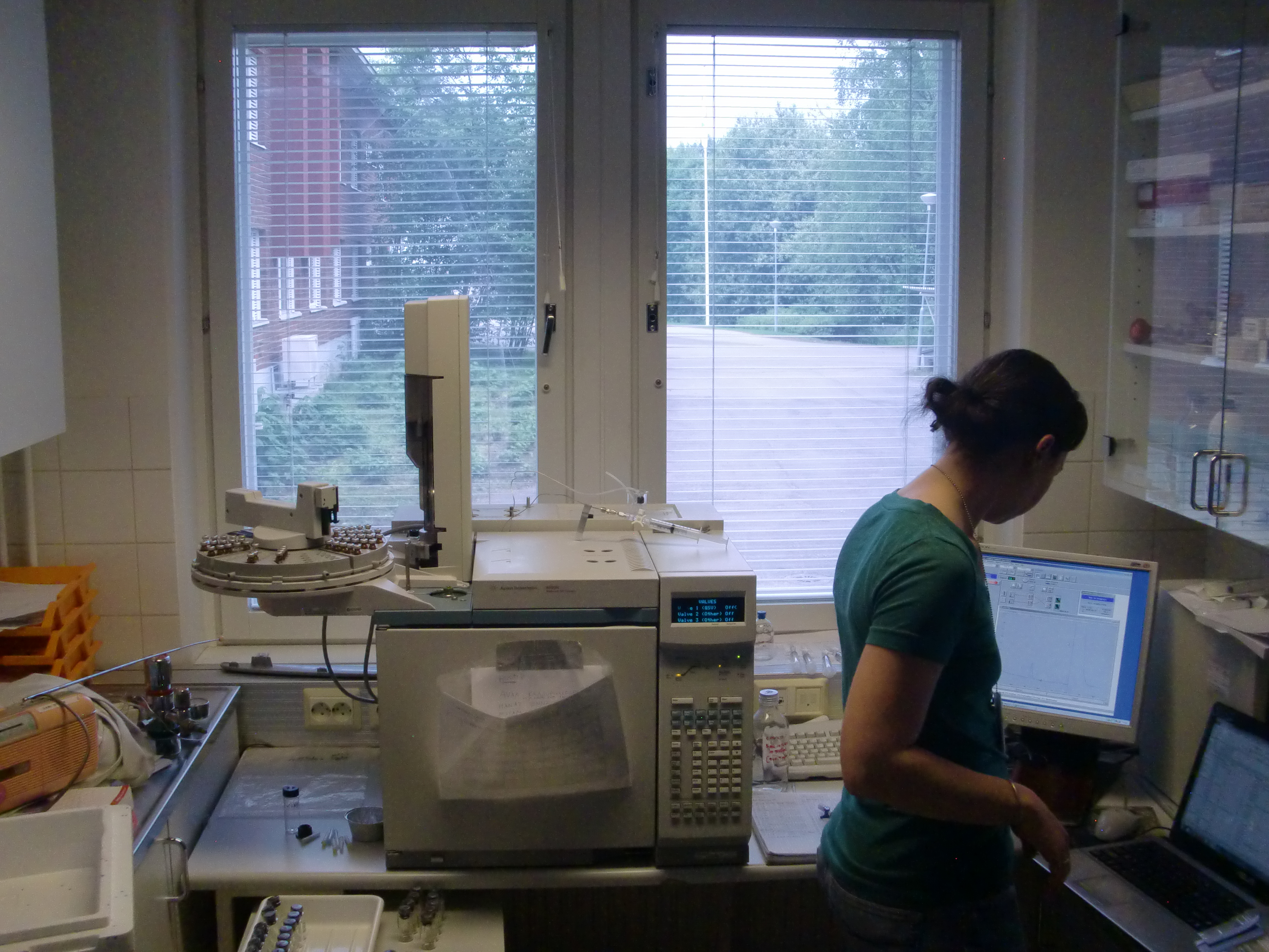 Kim Miller uses the gas chromatograph at the METLA lab. Rovaniemi, Finland.