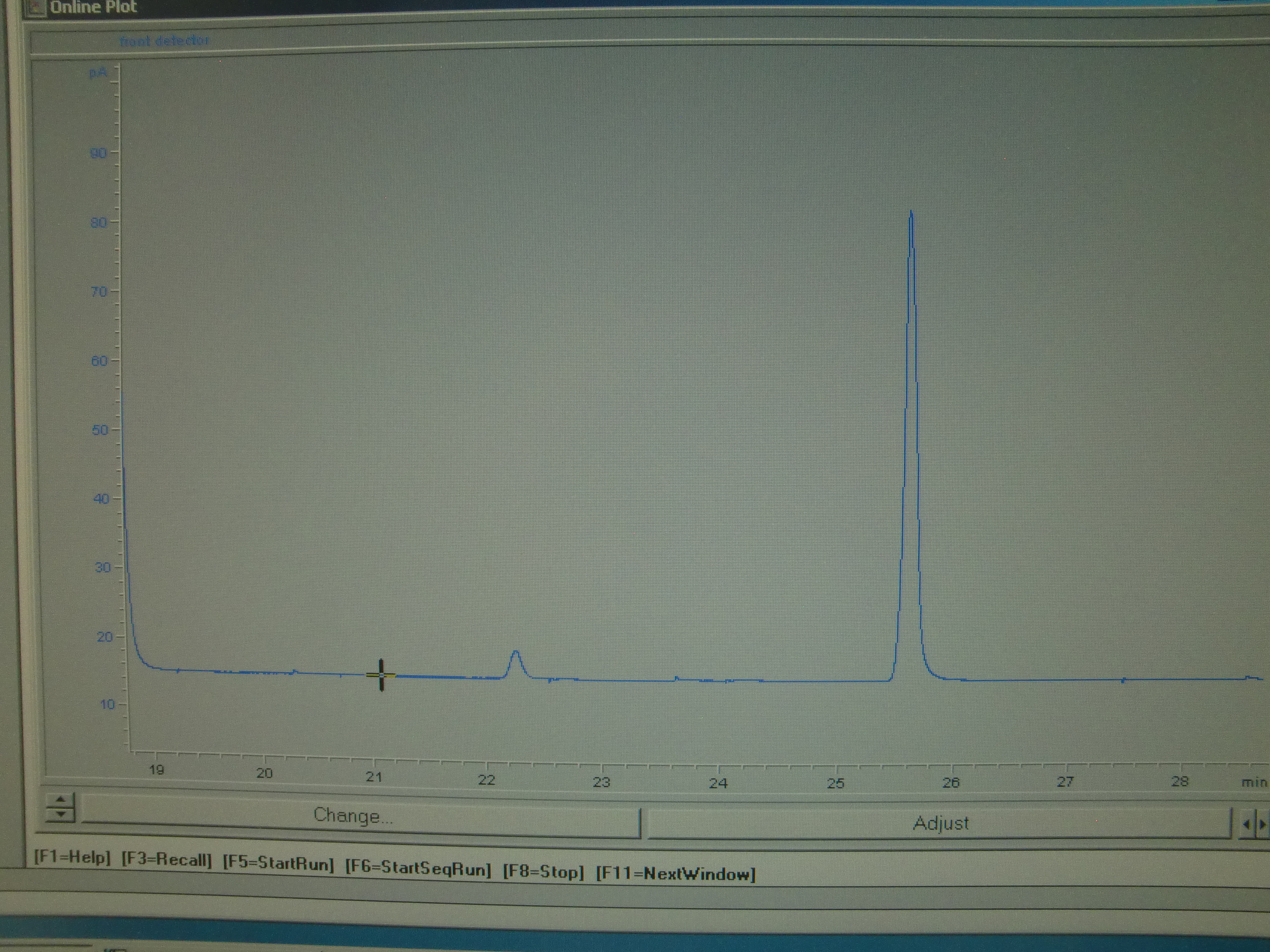 The small peak on the left is from the T0, or Time 0 gas sample for a collar after the cap is put on. The larger peak on the right is from the T1, or Time 1 sample, taken after the cap has been on the collar for 20 minutes. Rovaniemi, Finland.