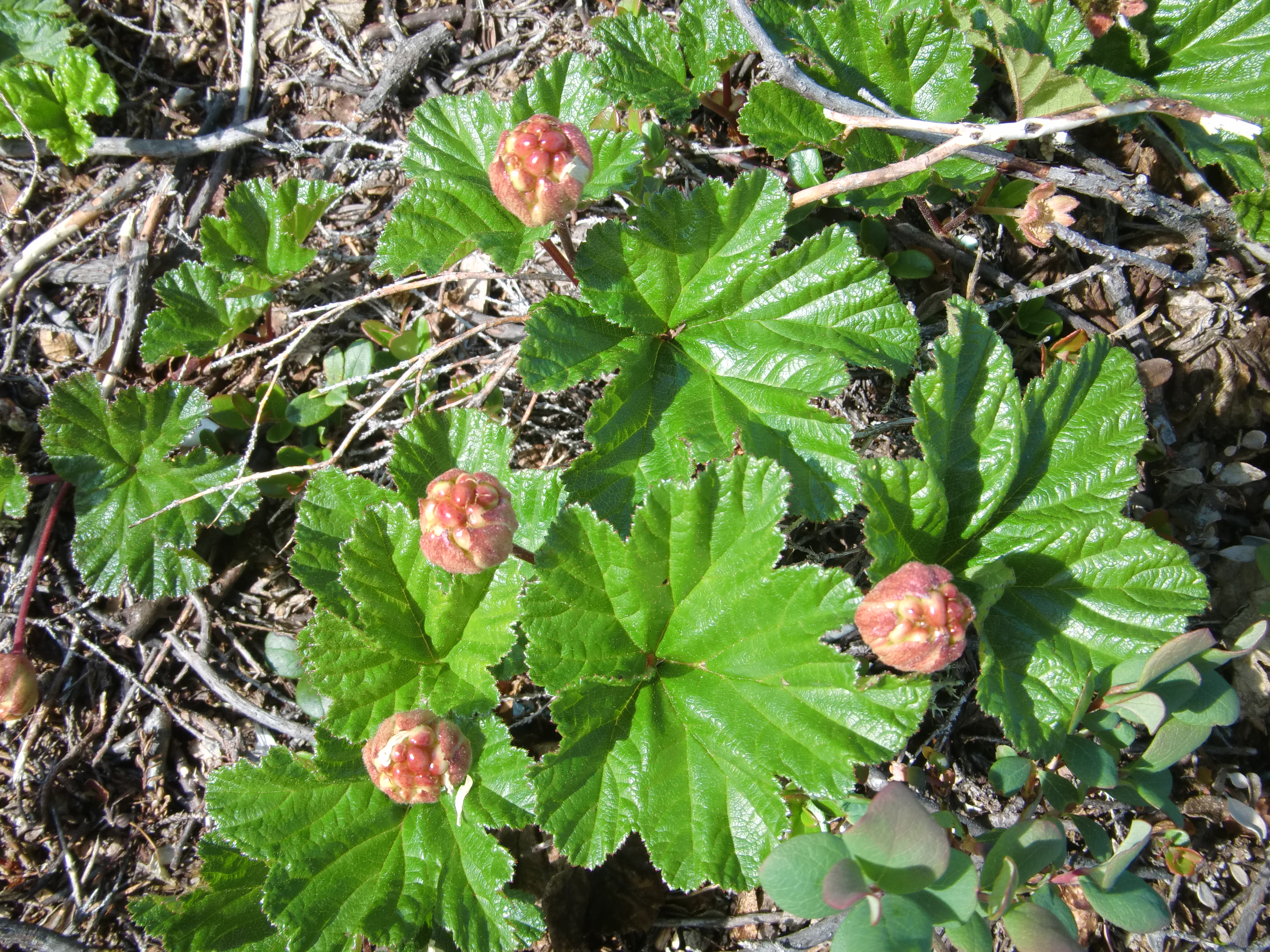 The Cloudberry, Rubus chamaemorus, is an edible northern fruit. They ripen into a soft, pale yellowish-tan berry. Petsikko wetland south of Kevo Research Station, Finland.