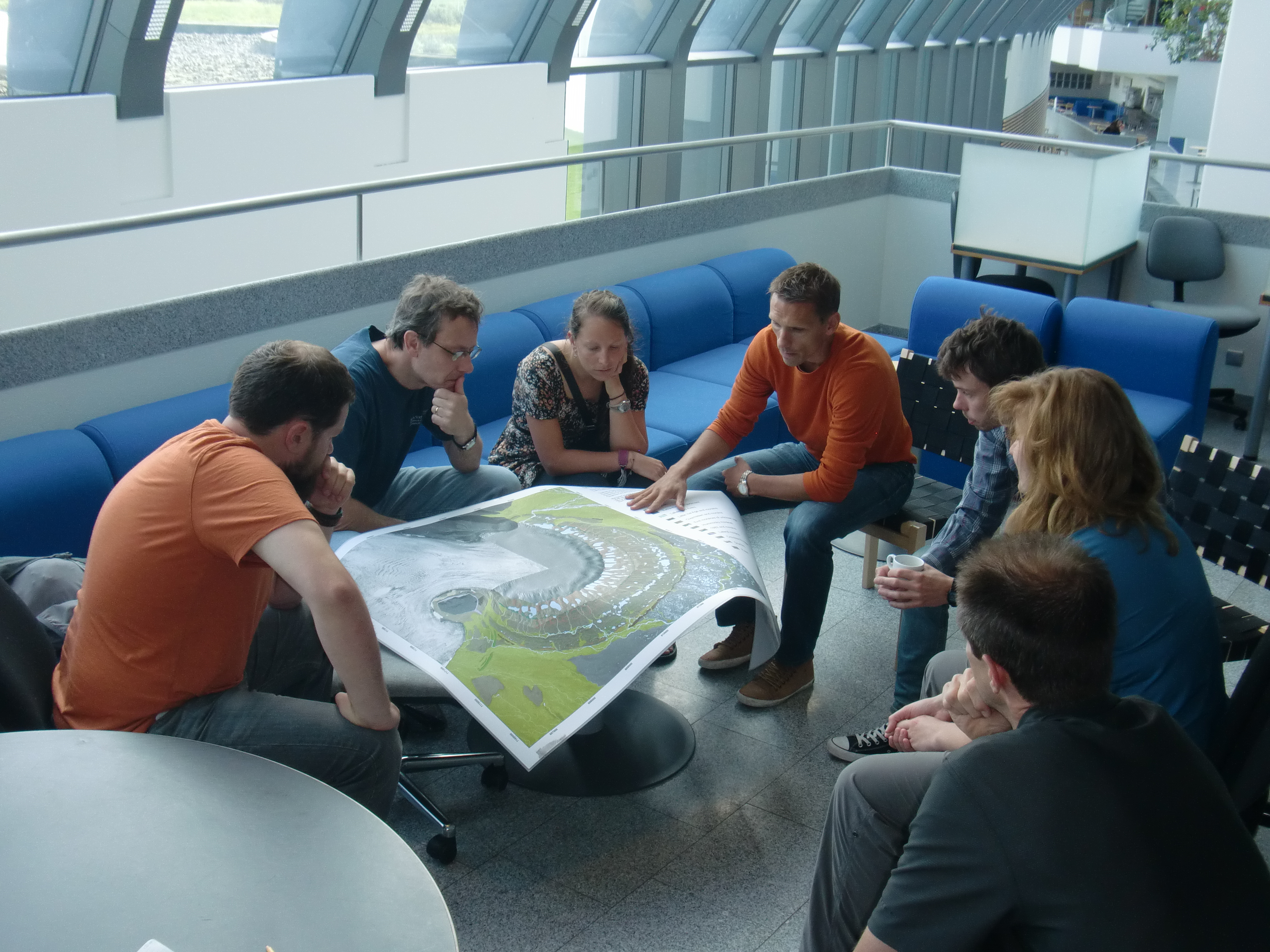 The majority of the team assembled for the first time to review a map of the geomorphology of the Múlajökul landscape. Clockwise: Luke Zoet, Neal Iverson, Reba McCracken, Ivar Benediktsson, Sverrir Jonasson, Libby Woodford, and Tom Hooyer. Reykjavík, Iceland.