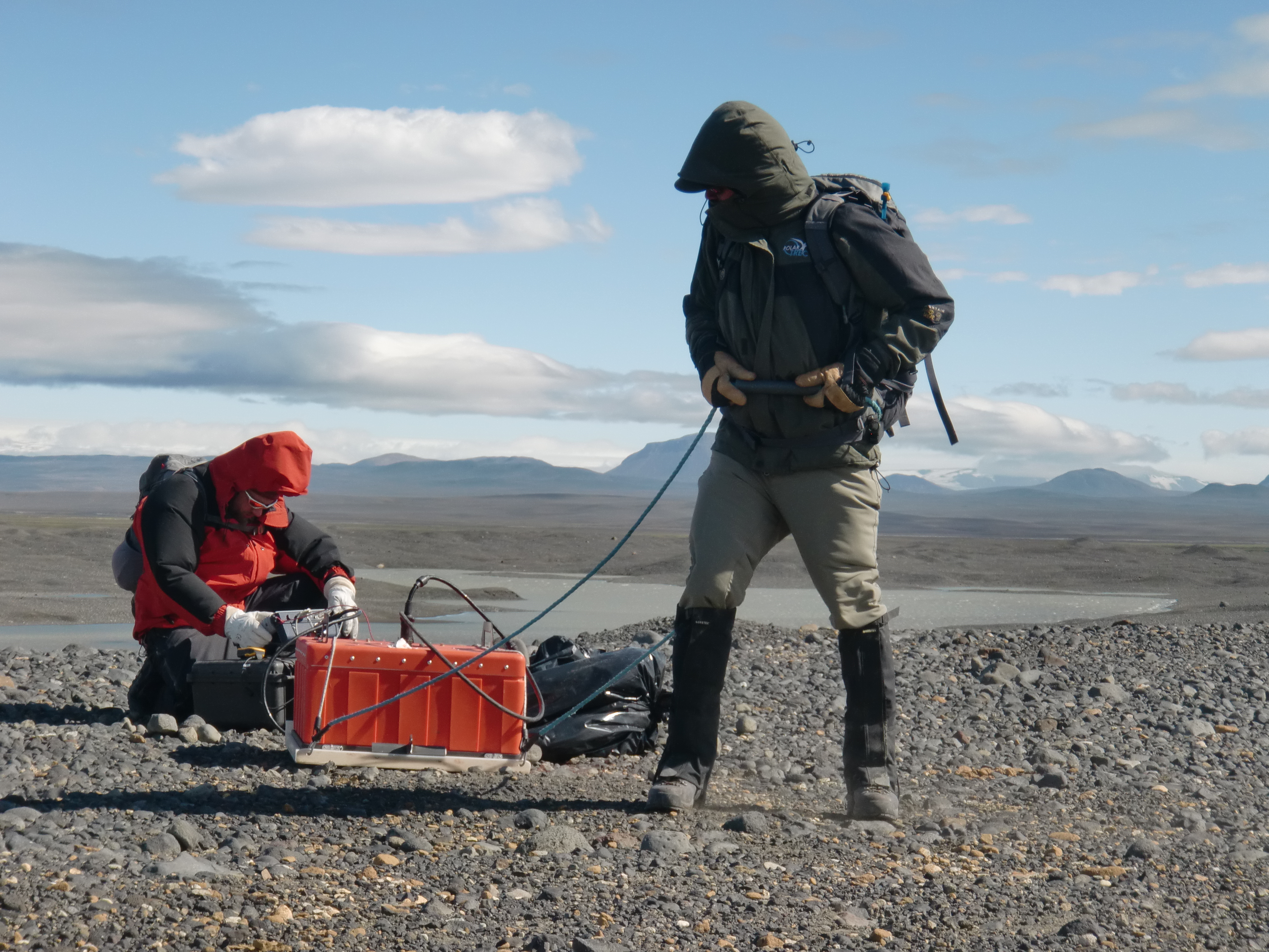 Jamie Esler gets ready to pull the GPR (Ground-Penetrating Radar) unit for Luke Zoet. At Múlajökul glacier in Central Iceland.