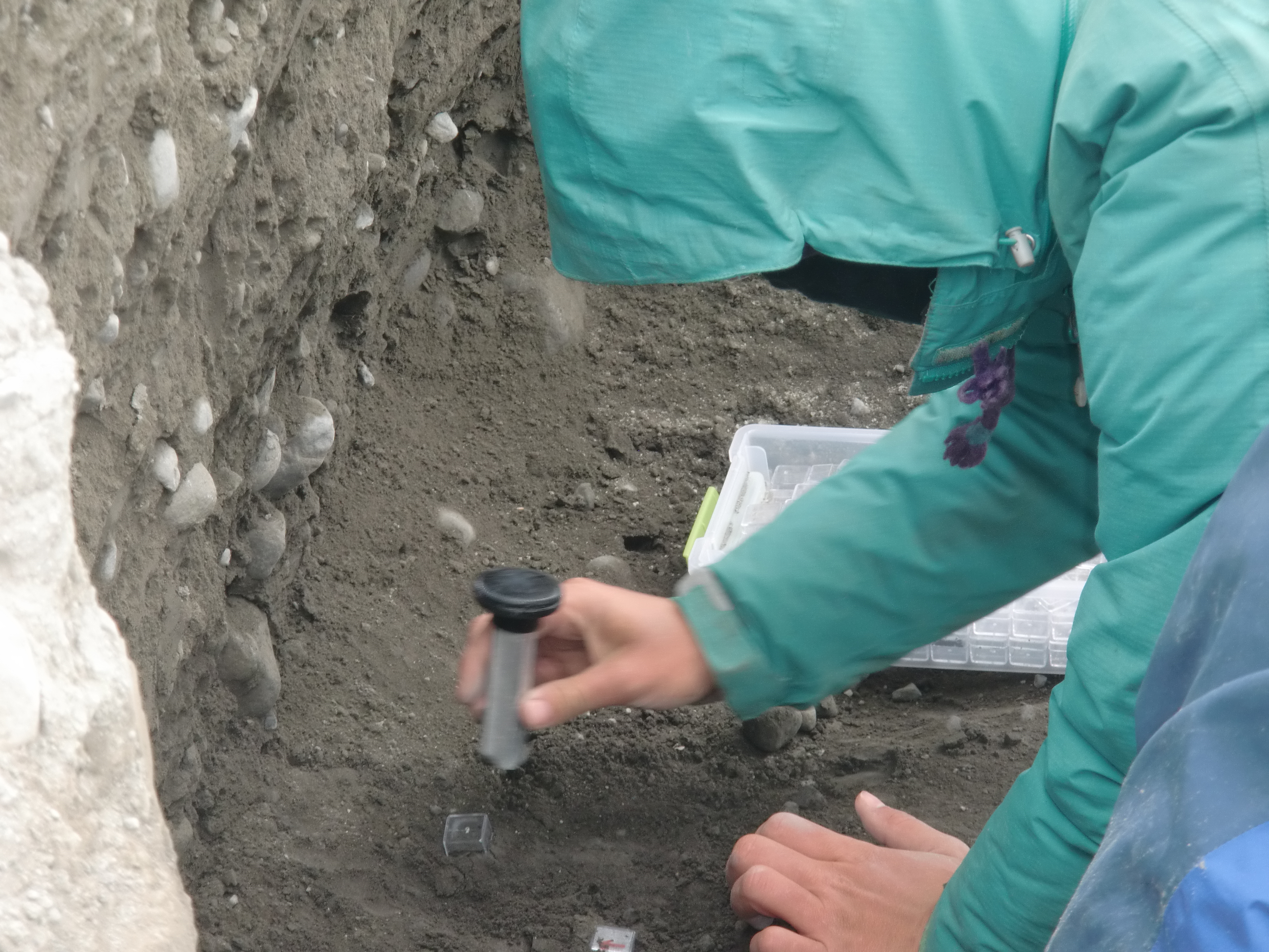 Reba McCracken works to insert a plastic sample cube into the till during AMS sampling. At Múlajökul glacier in Central Iceland.