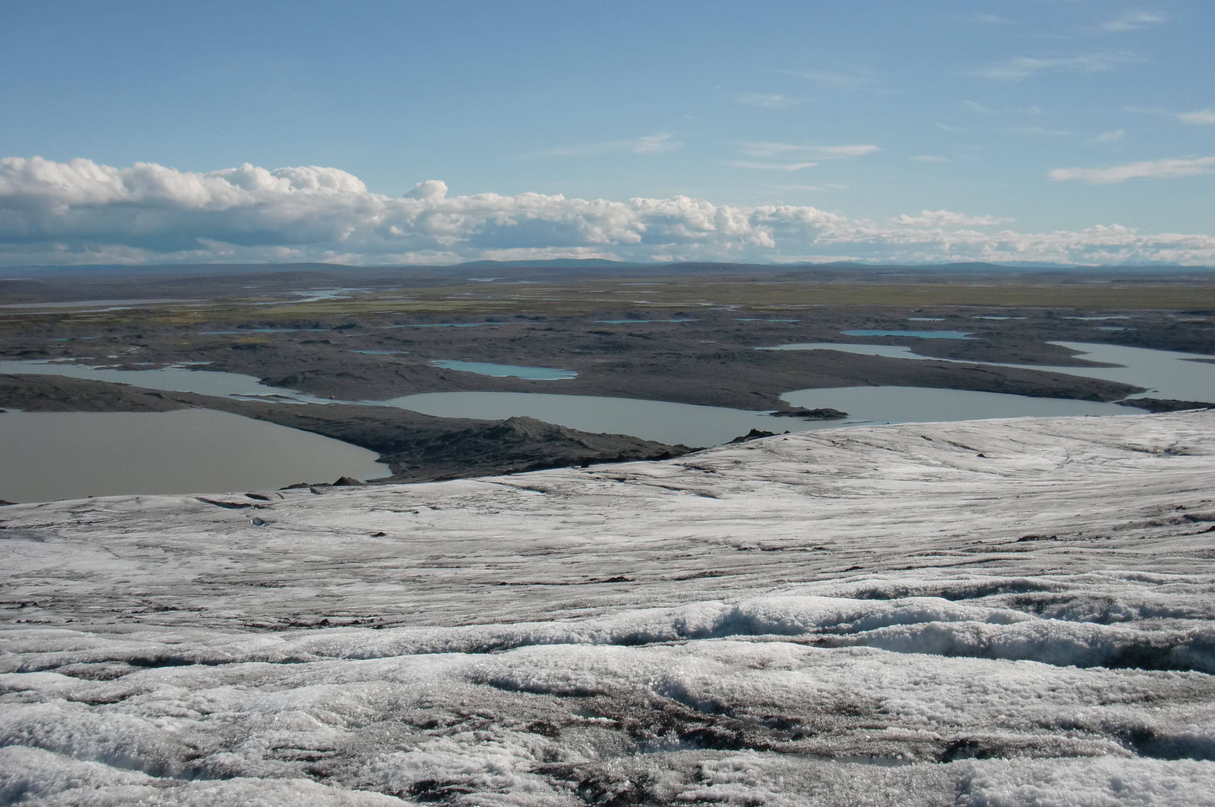 A view of the drumlin field from on top of Múlajökul glacier. The drumlins radiate out with meltwater lakes in between them. At Múlajökul glacier in Central Iceland.