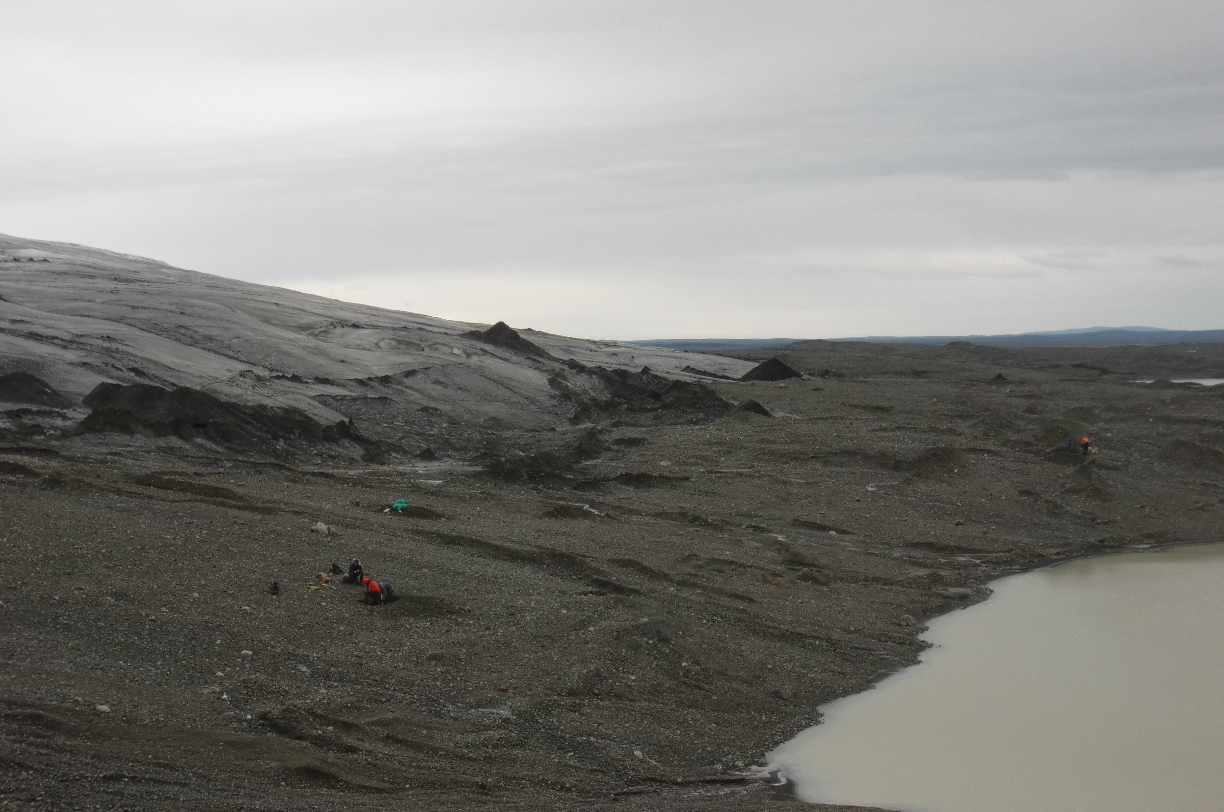 The team makes their way across the inter-drumlin testing area towards Drumlin #2. Dr. Tom Hooyer and Dr. Neal Iverson are on the far right in the last sampling pit of Drumlin #1. Libby Woodford and Reba McCracken are in the middle, completing work in the first pit of the inter-drumlin. On the left you can see James Amato, Dr. Luke Zoet, Geoff Gadd, and Jamie Esler excavating the second pit of the inter-drumlin. At Múlajökul glacier in Central Iceland.