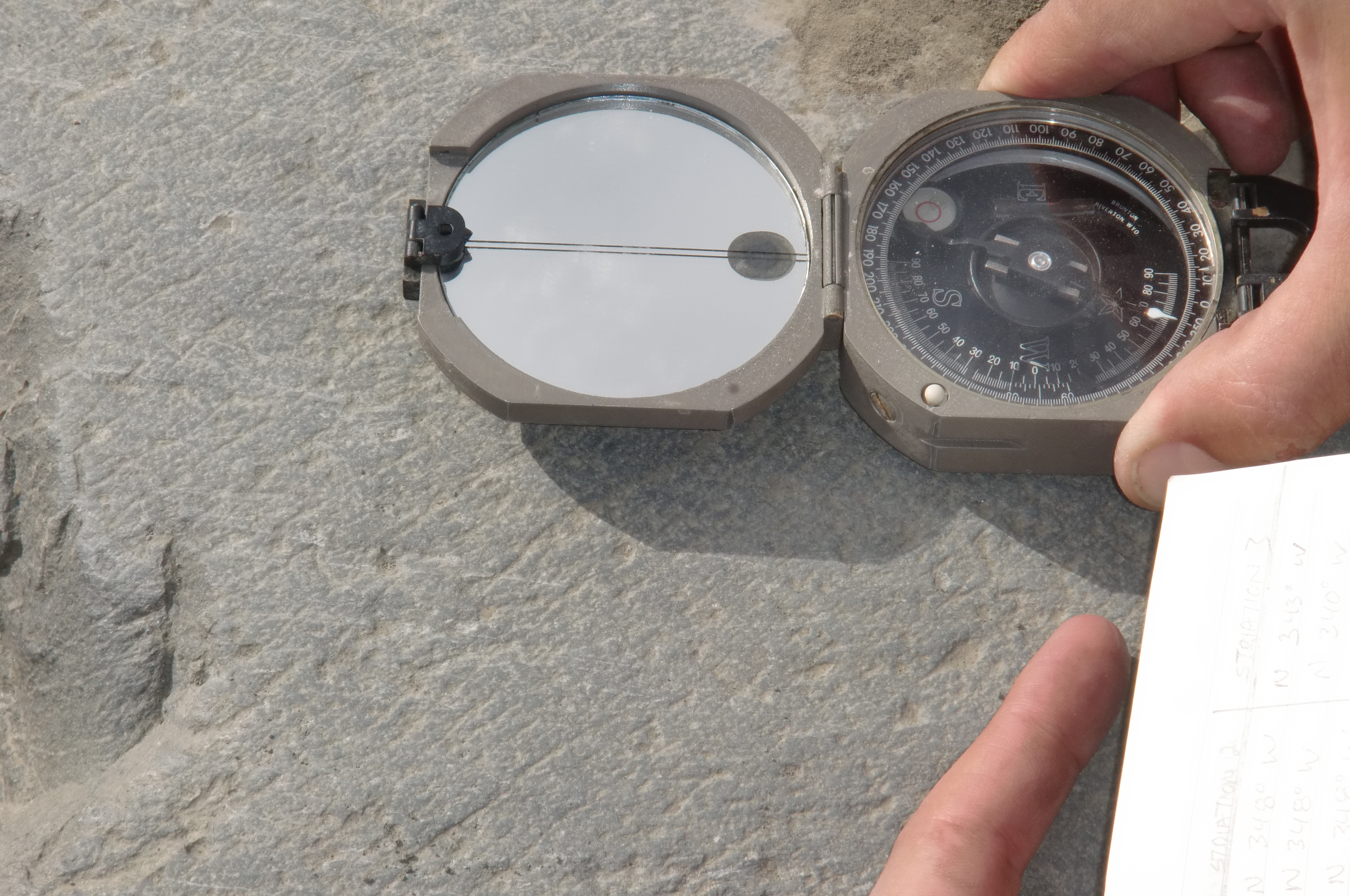 A close-up of how James Amato uses his Brunton to measure the striations on the boulders. This particular boulder was challenging for James because it contains multiple sets of striations in different directions. At Múlajökul glacier in Central Iceland.