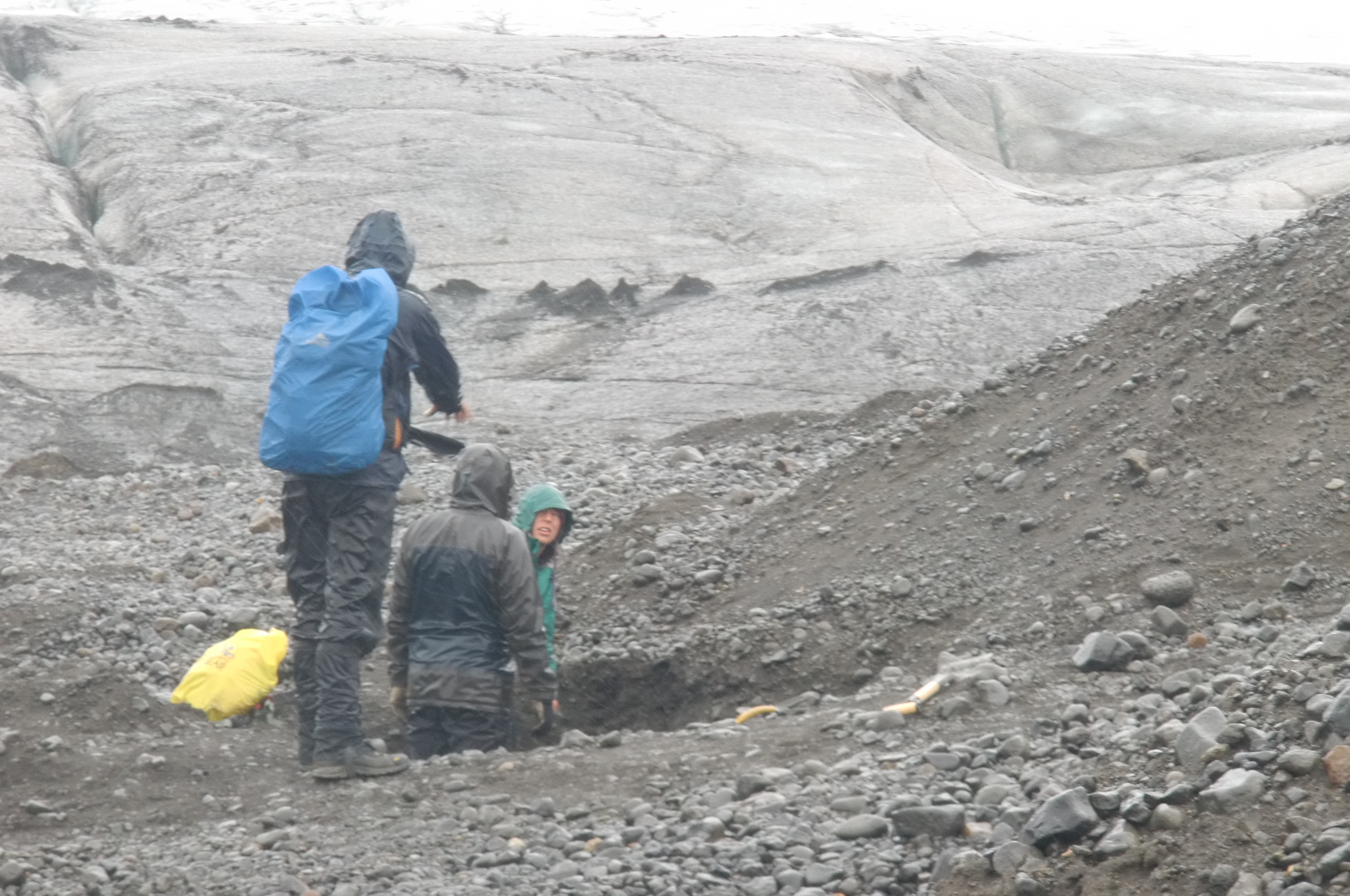 Geoff Gadd, James Amato, and Reba McCracken discuss their plan to cease data collection for the day due to excessive rainfall. They decide to head back to camp, warm up, and dry out in the cook tent. At Múlajökul glacier in Central Iceland.
