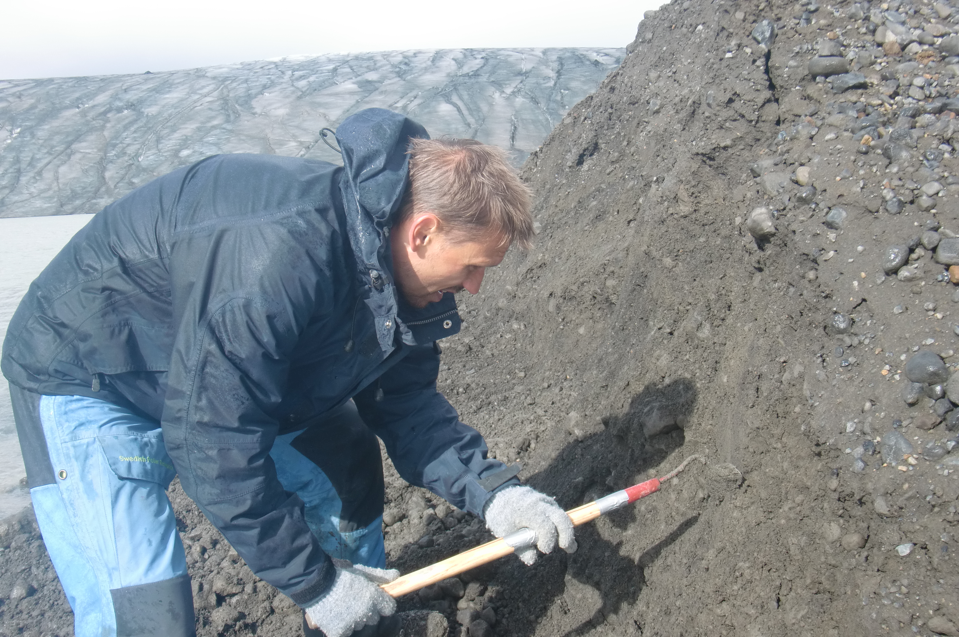 Ivar Benediktsson first cleans off a bit of colluvium before beginning to measure and log the stratigraphy of the 2008 end moraine. At Múlajökul glacier in Central Iceland.