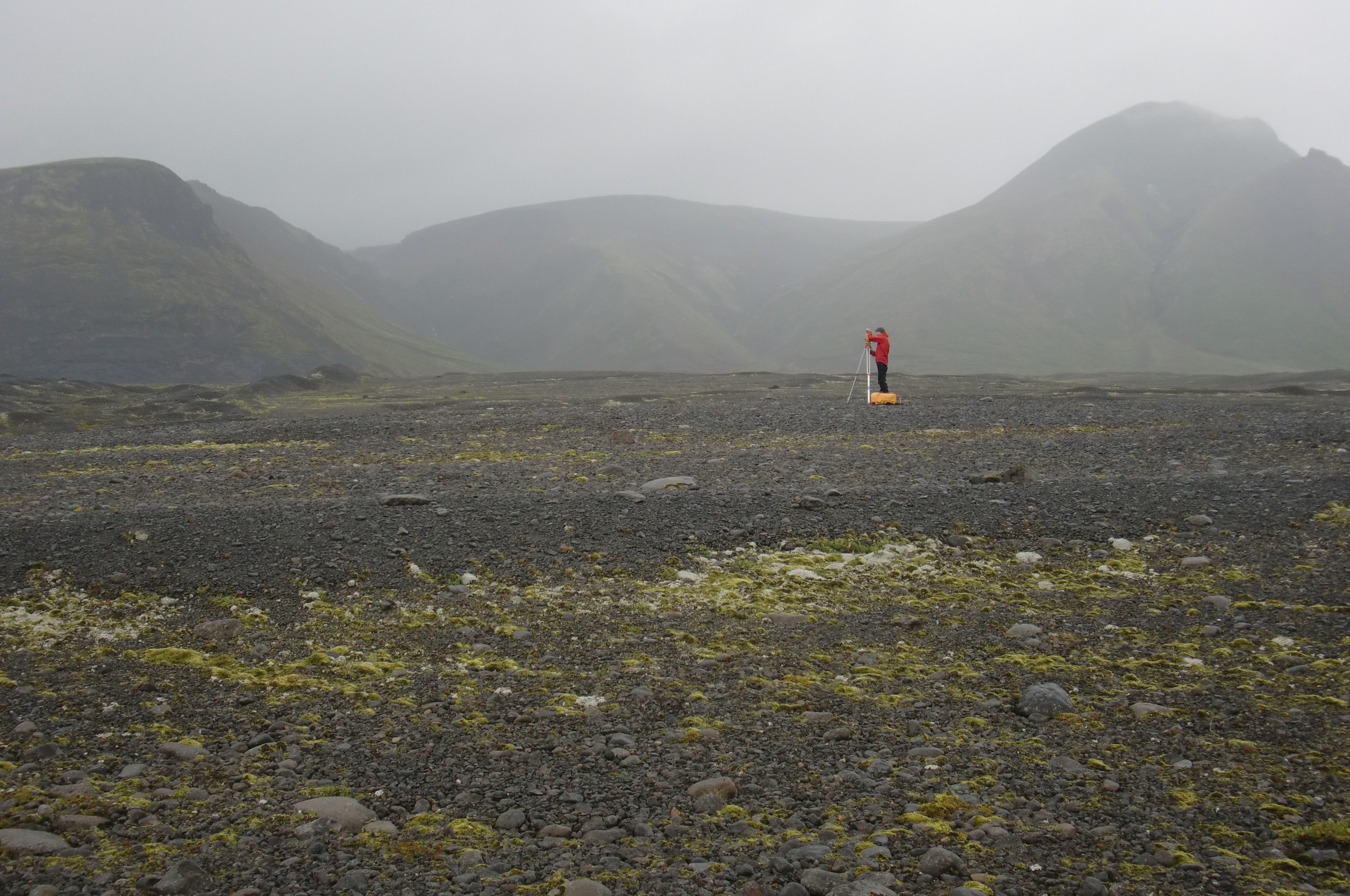 Sverrir Jonasson adjusts the Total Station surveying equipment to point exactly towards Anders Schomacker and the reflective mirror. At Múlajökul glacier in Central Iceland.