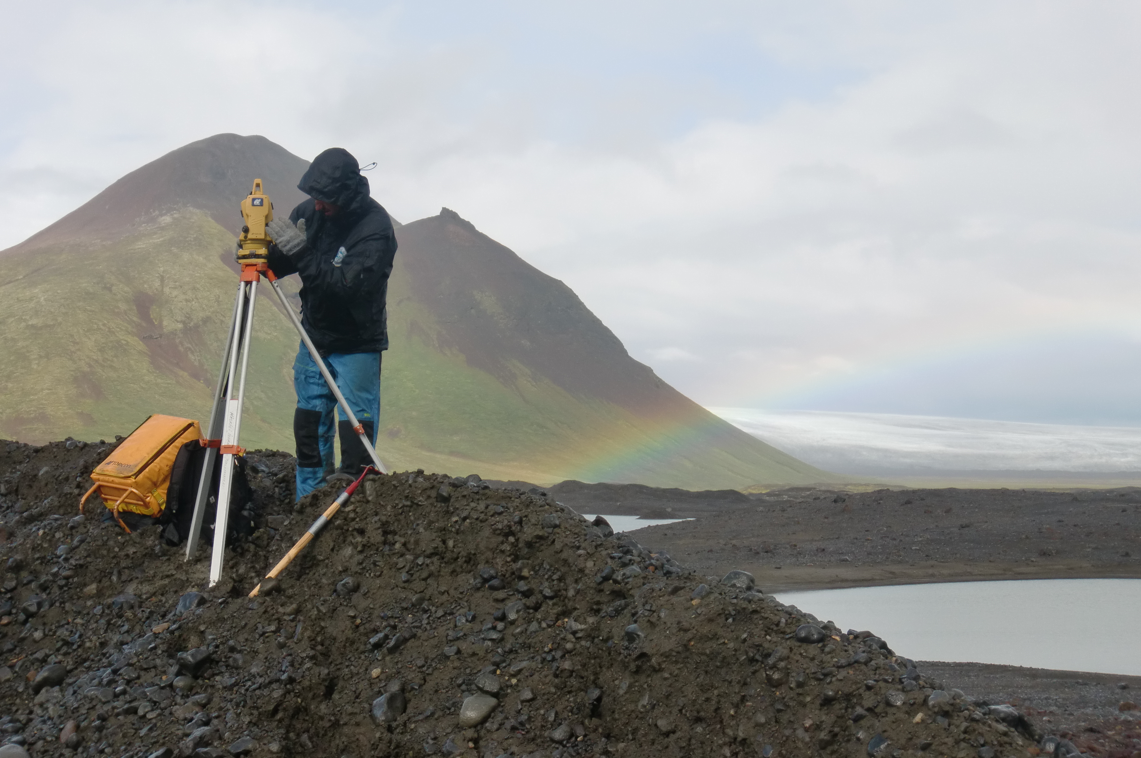 Ivar Benediktsson prepares the Total Station surveying equipment. At Múlajökul glacier in Central Iceland.