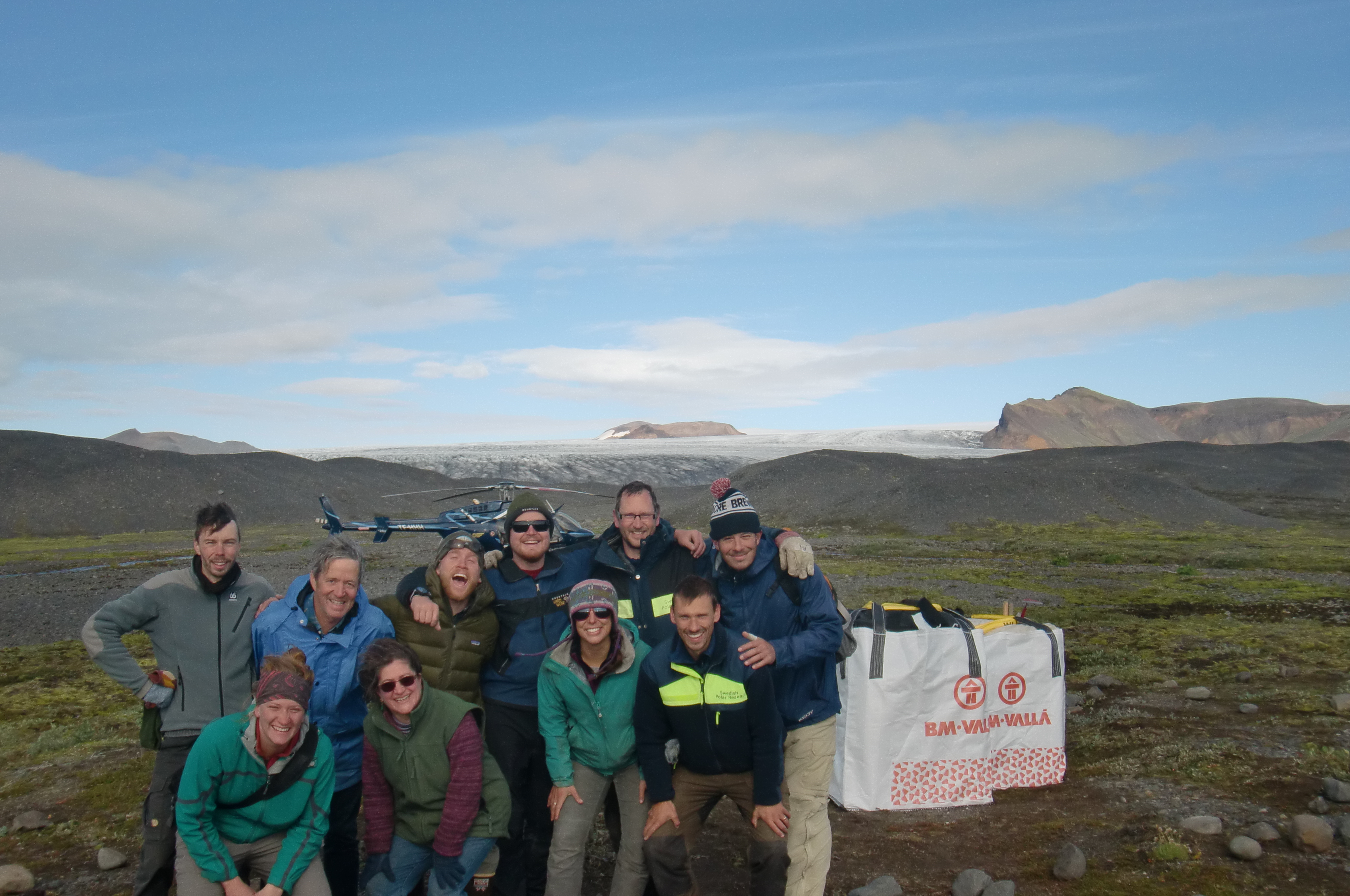 One last group photo of the remaining team members before ferrying gear and people out of base camp. At Múlajökul glacier in Central Iceland.