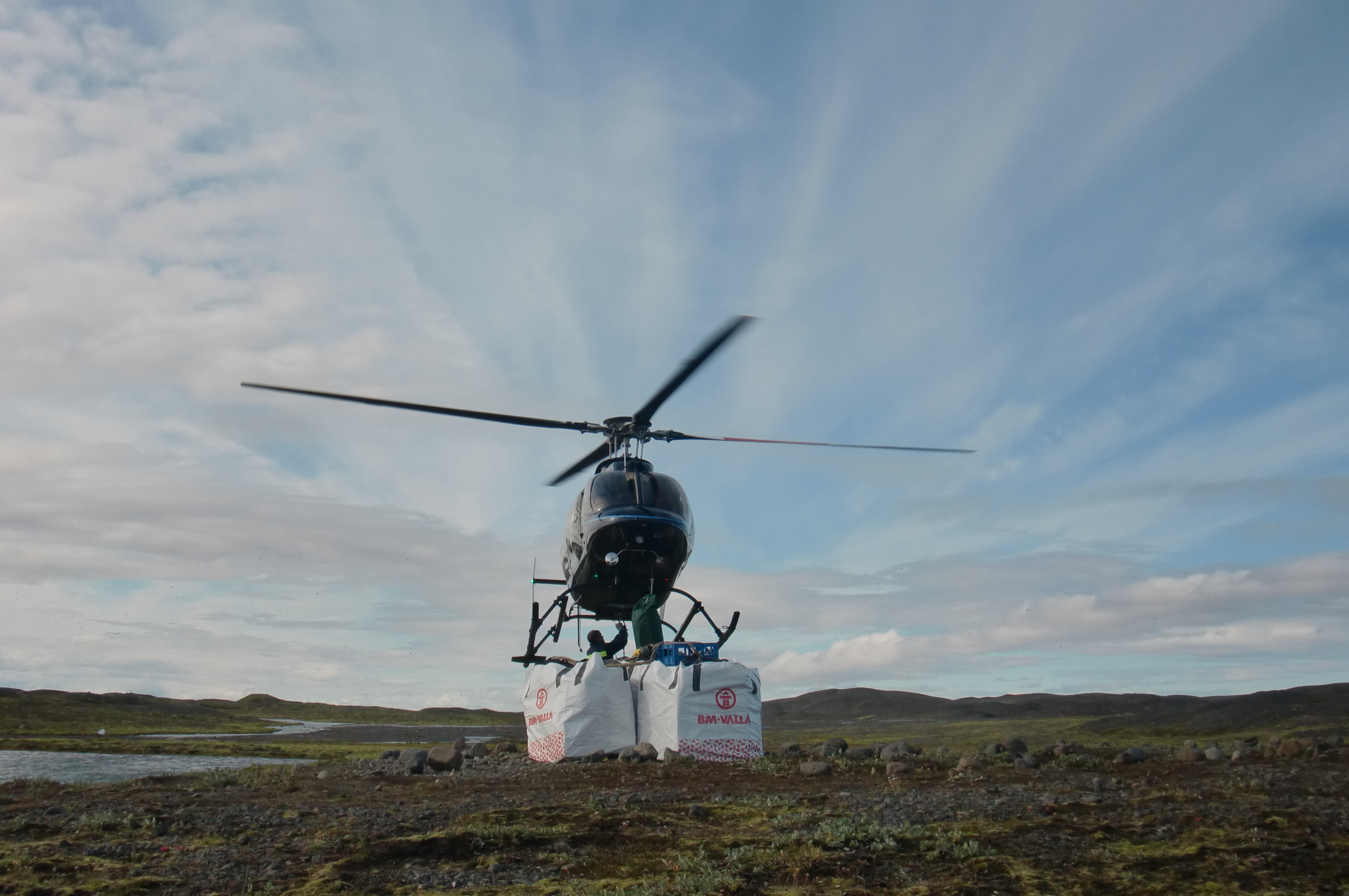 Ivar Benediktsson focuses his concentration on hooking the sling loads to the steel cable while the helicopter hovers less than one meter over his head. At Múlajökul glacier in Central Iceland.