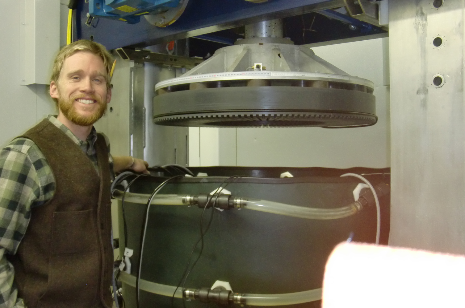 Jamie Esler: "Here I am checking out the mechanics of the device. Dr. Neal Iverson explained to me how the hyrdaulic lift pushes samples of ice or till into the ring plate above, and then rotates to simulate shear stress at a glacier's base." Ames, Iowa.