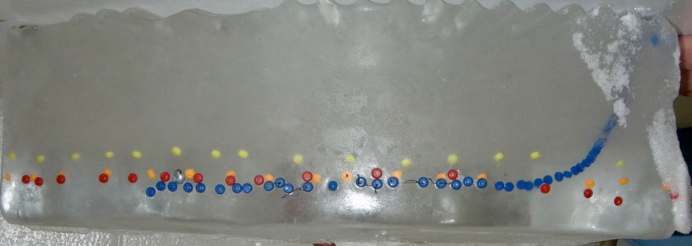 A close-up of a portion of Dr. Luke Zoet's model from the his ring shear tests. The blue beads help determine shear stress, and the red and yellow beads help measure the rate of shear and deformation of the ice. Ames, Iowa.