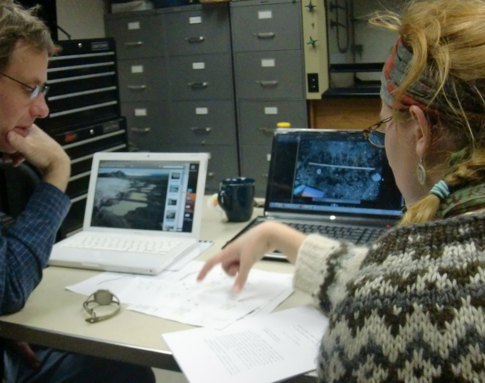 Libby Woodford seeks valuable feedback and input from Dr. Neal Iverson and Dr. Tom Hooyer regarding her initlal AMS data from the flutes of Múlajökul's forefield. Milwaukee, Wisconsin.