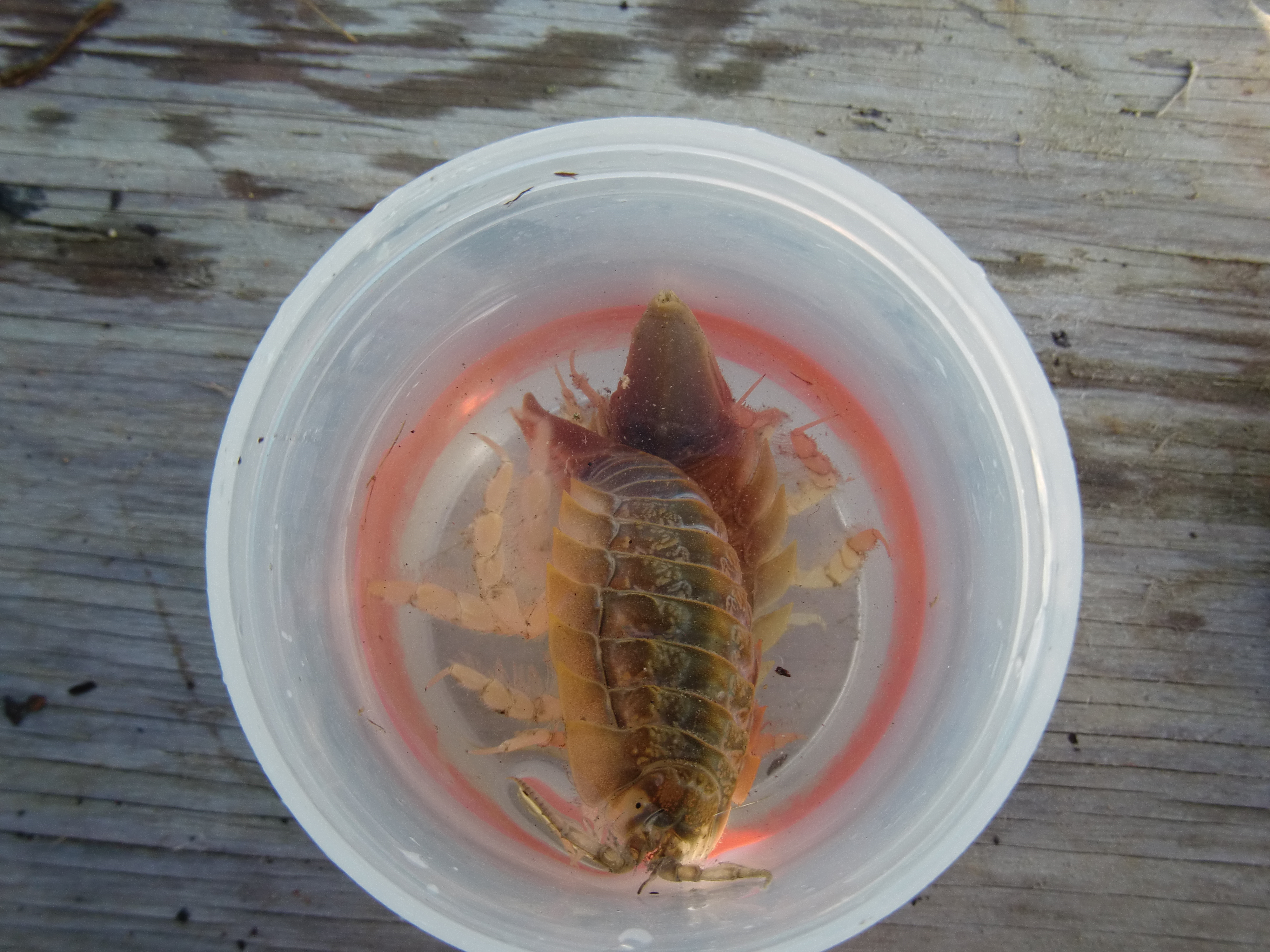 Two large isopods were in this sample. They will travel back to the bunkhouse in this vial. Kaktovik, Alaska.