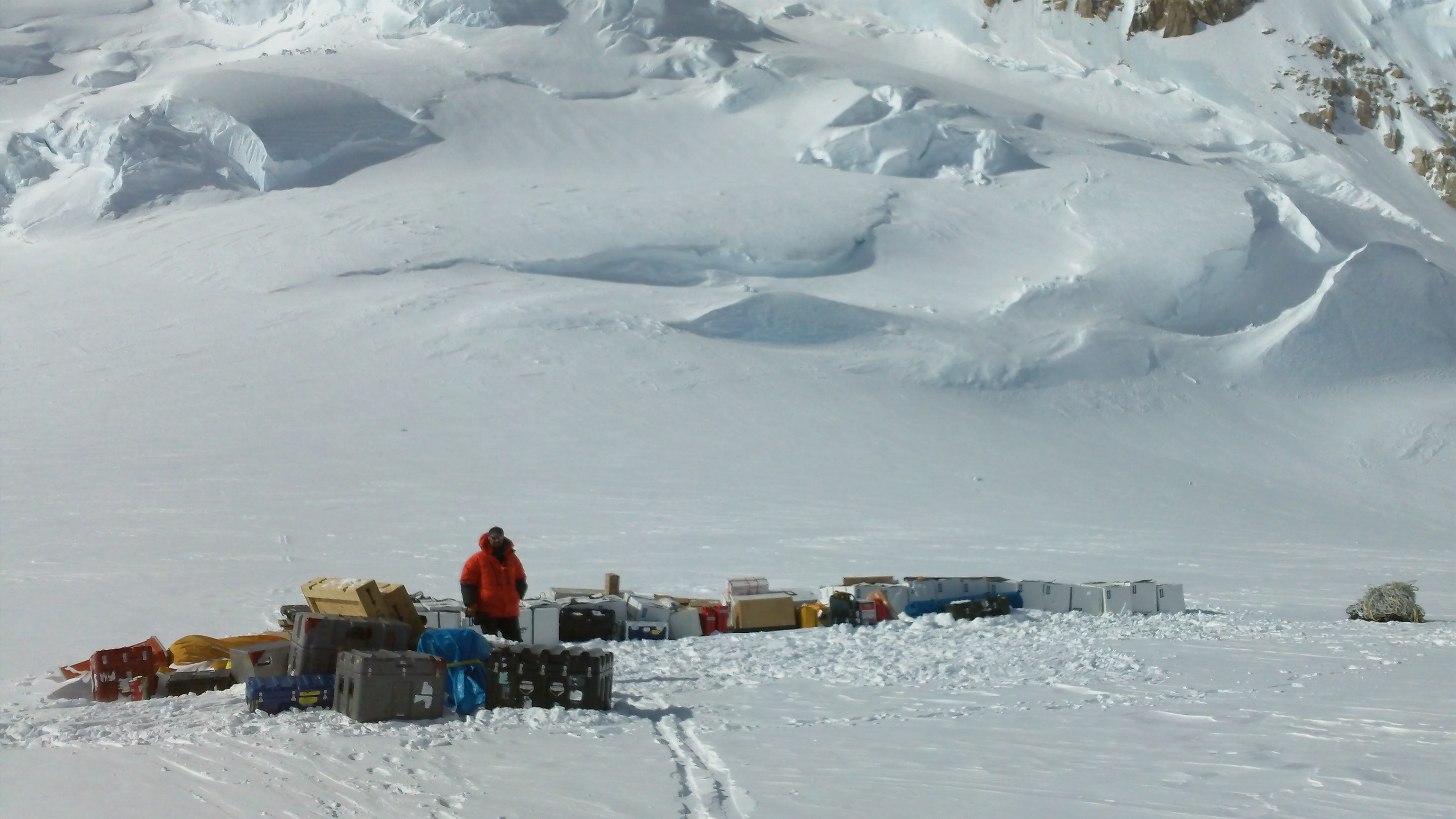 Drill site gear atop the Mount Hunter Ice Divide ready to be set up and deployed at the site. Mount Hunter Ice divide, Denali National Park, Alaska.