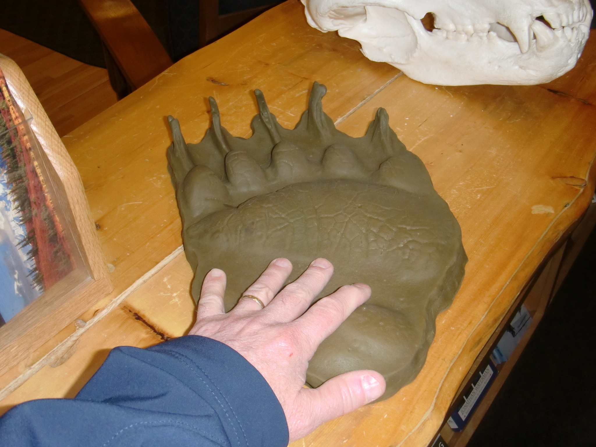 This cast clearly shows the size of a grizzly bear paw compared to Ken Williams' hand. At the ranger station in Talkeetna, Alaska. Talkeetna, Alaska.