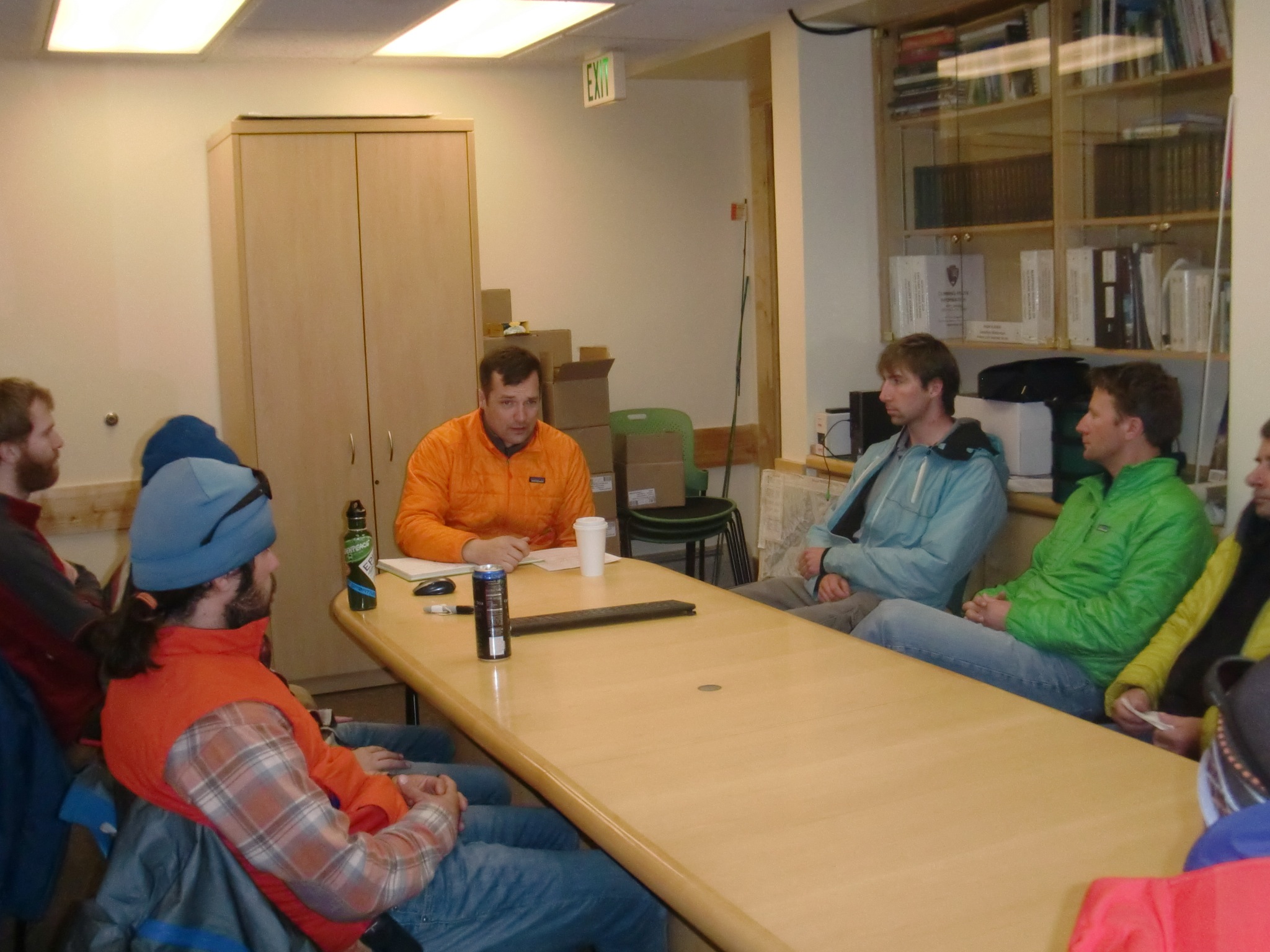Ken Williams: "All climbers of Denali are required to have a safety briefing and ours included helicopter logistics from Chief Climbing Ranger John Leonard. Karl Kreutz, Dom Winski, Brad Markle, Dave Silverstone, and Tim Godaire listen to John." Talkeetna, Alaska.