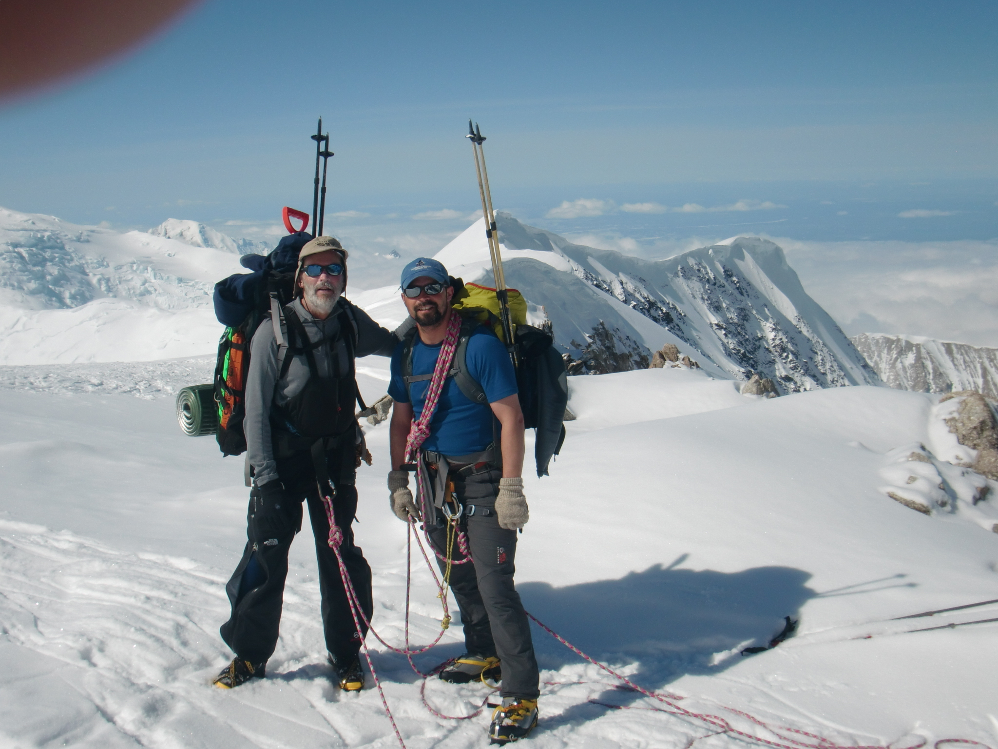 Seth Campbell and Ken Williams pose for a photo during a lunch break above Motorcycle Hill. Kahiltna Glacier, Denali National Park, Alaska.