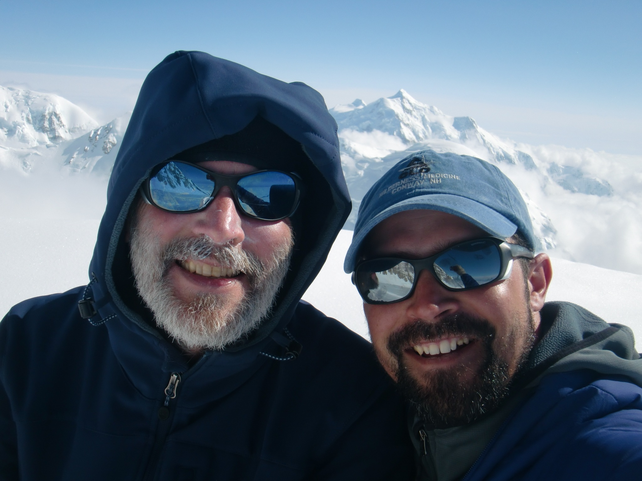Teacher Ken Williams and former student, now researcher, Seth Campbell at 13,400 feet on a small satellite peak off of Windy Corner, with Mount Hunter in the background. Kahiltna Glacier, Denali National Park, Alaska.