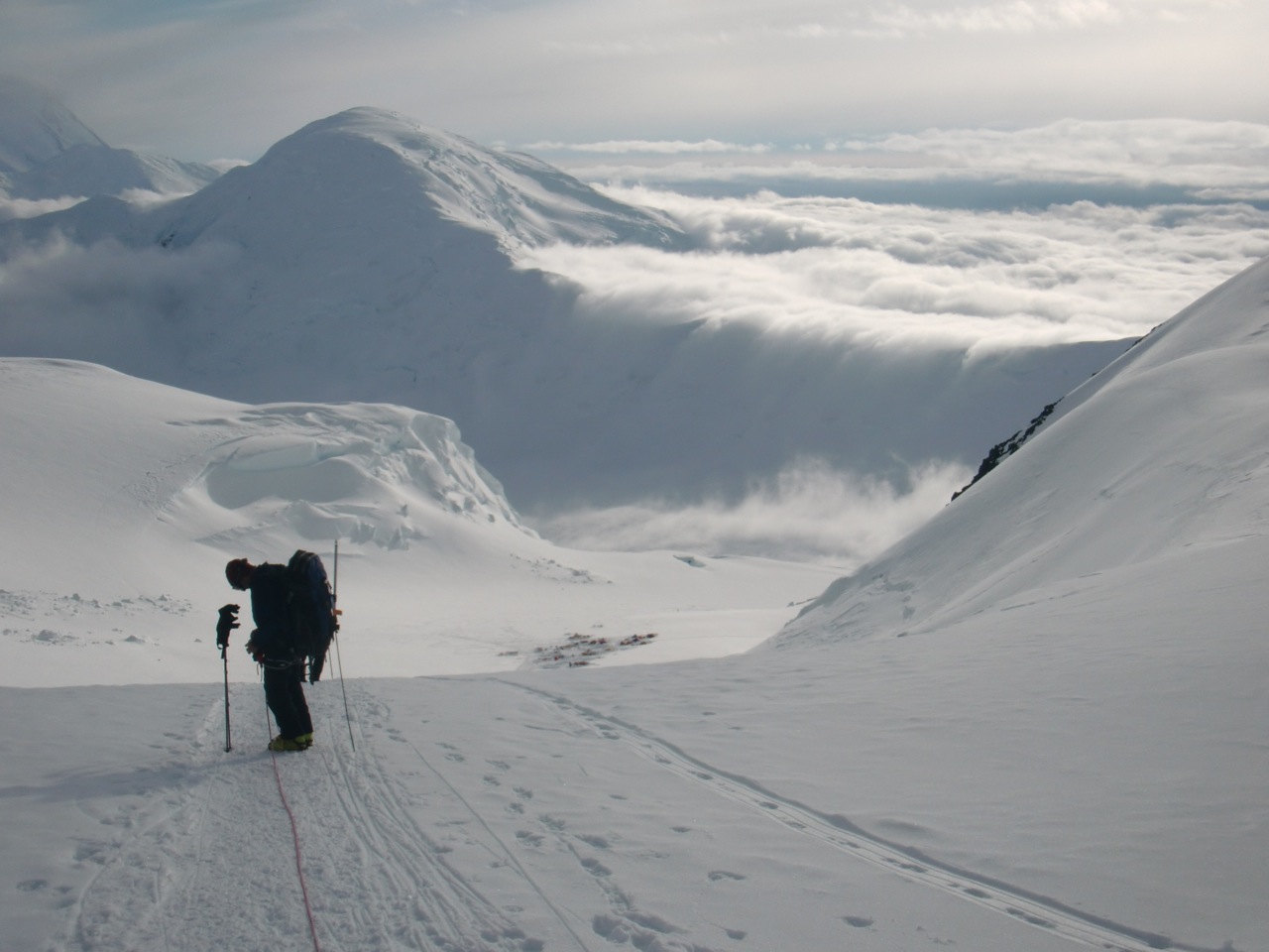 Clouds are spilling over a ridge in the distance as Mike Waszkiewicz looks on. Motorcycle Hill, Kahiltna Glacier, Denali National Park, Alaska.
