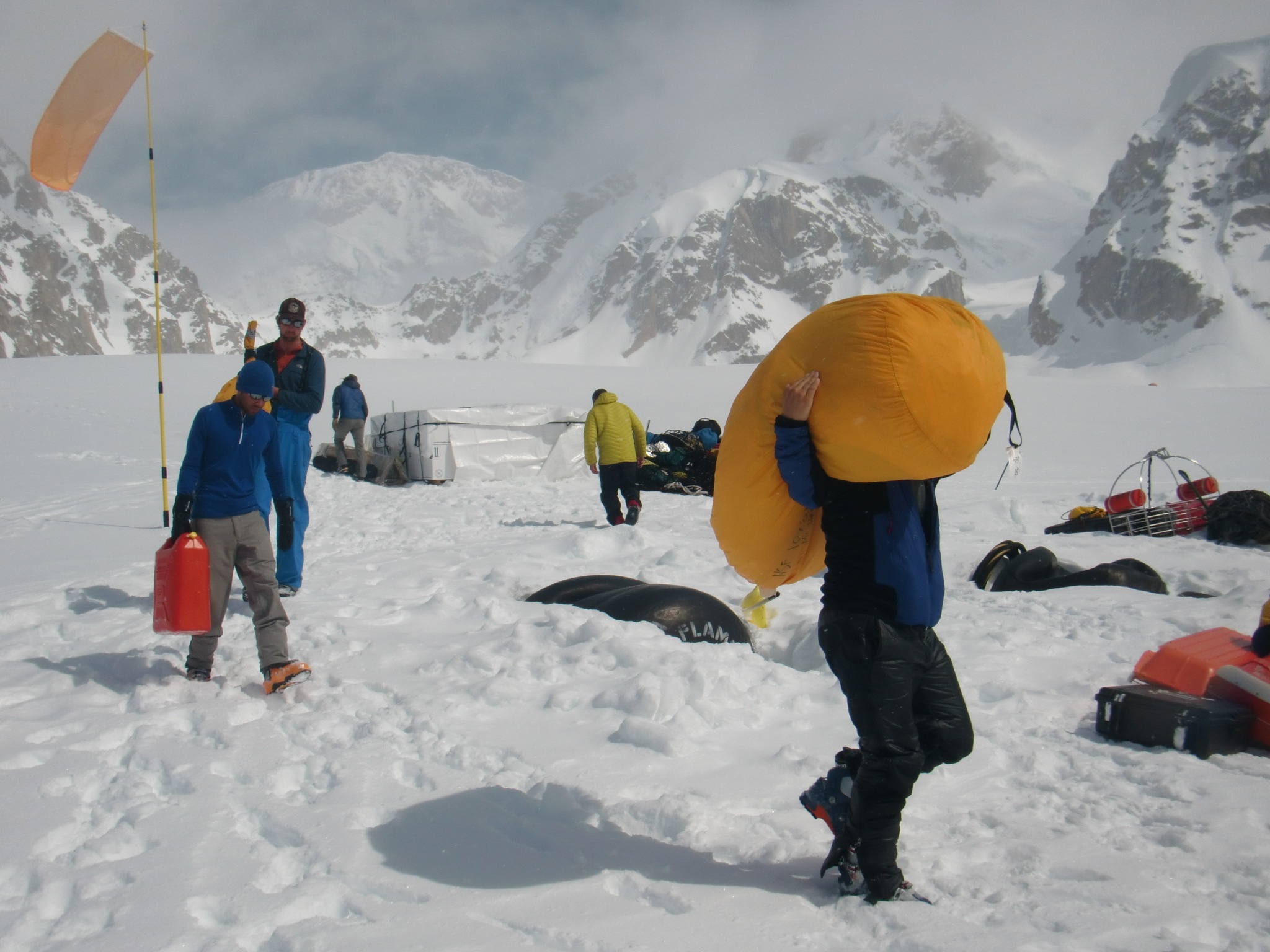 Team members move gear from piles stored at the helicopter landing area to the sling load building and pickup area. Basecamp on Kahiltna Glacier, Denali National Park, Alaska.