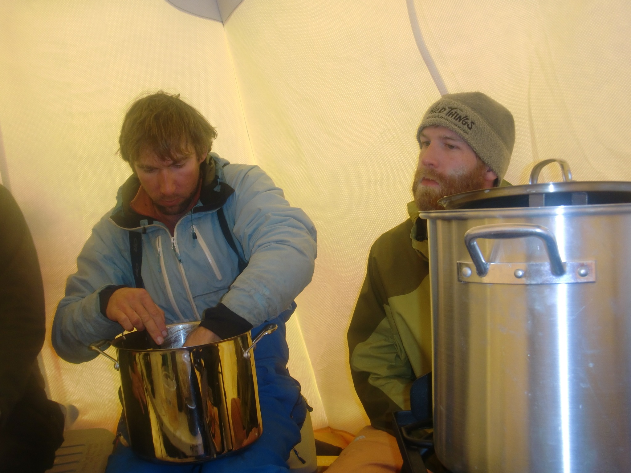 Ken Williams: "Dom Winski (left) and TIm Godaire enjoy some pot scraping in order to get the last few bites of a very awesome dinner." Basecamp on Kahiltna Glacier, Denali National Park, Alaska.