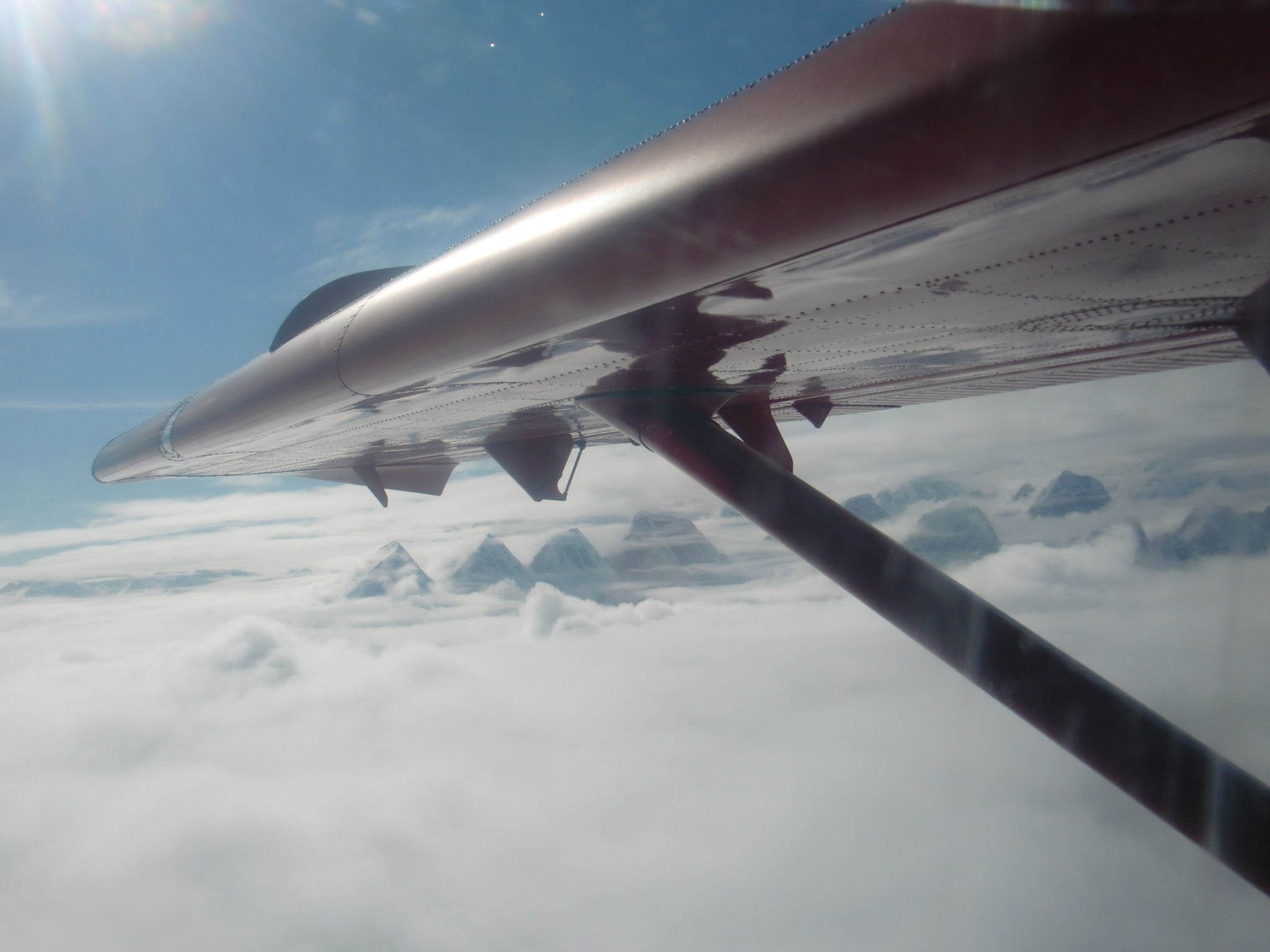 A view of the terrain leaving Denali National Park from the cockpit of a Talkeetna AIr Taxi plane. Above Denali National Park, Alaska.